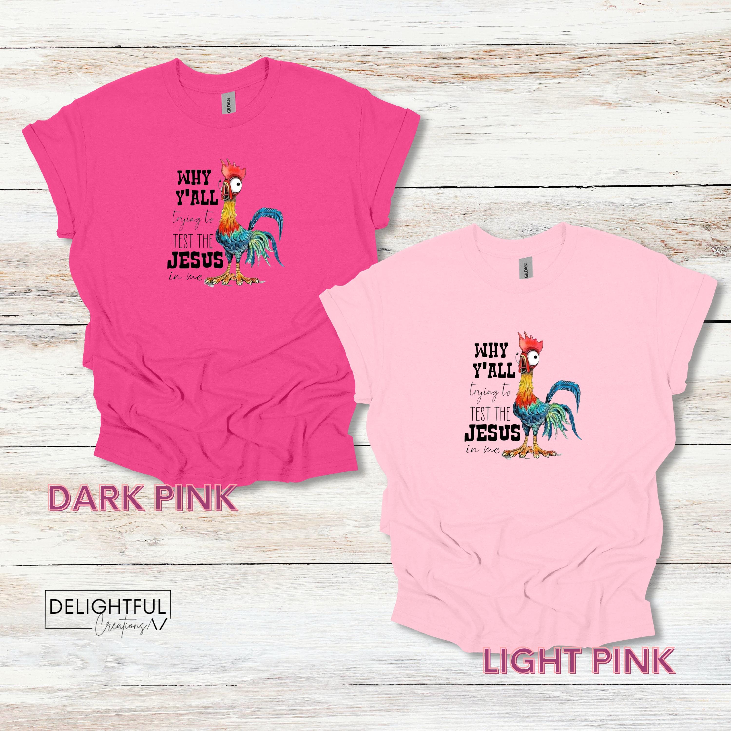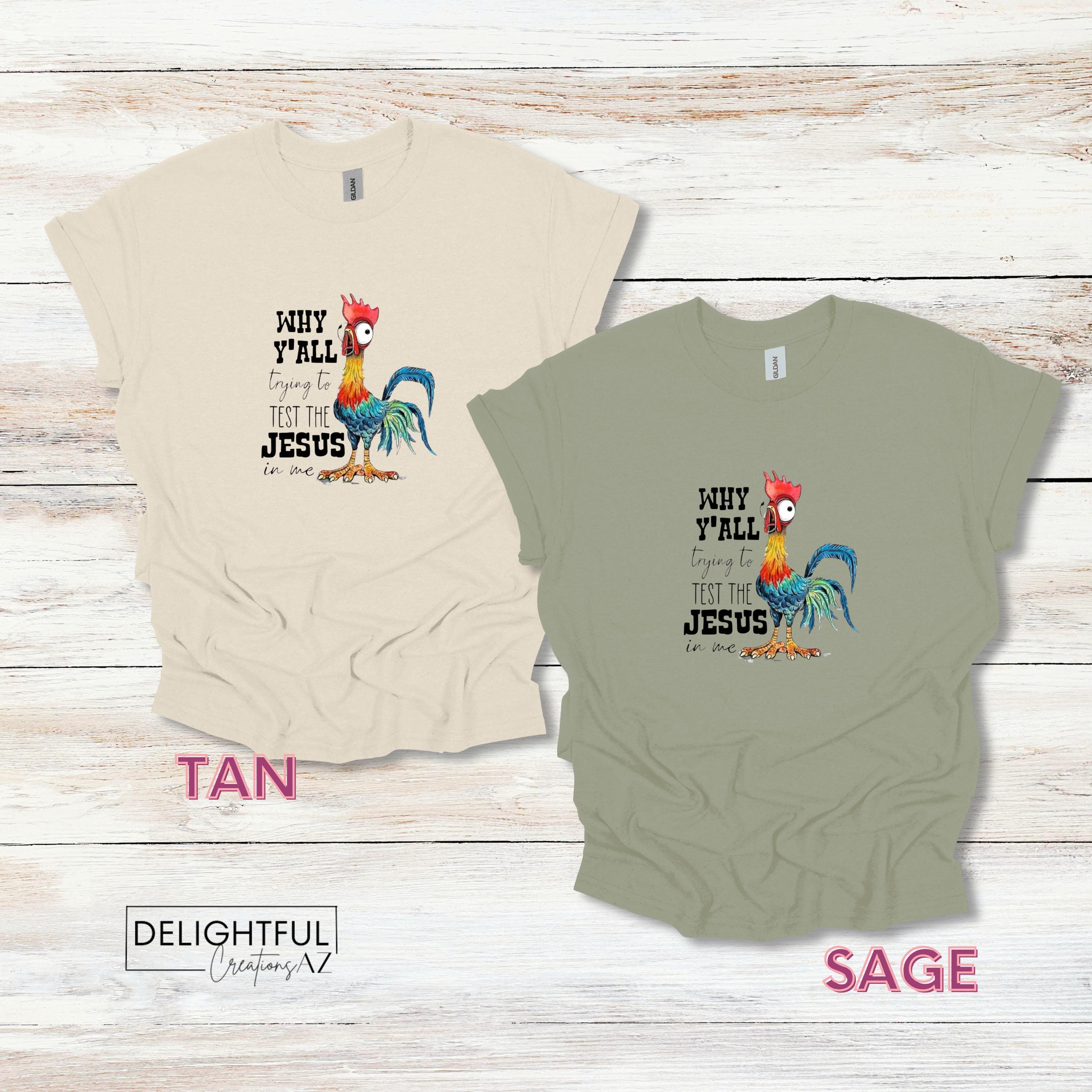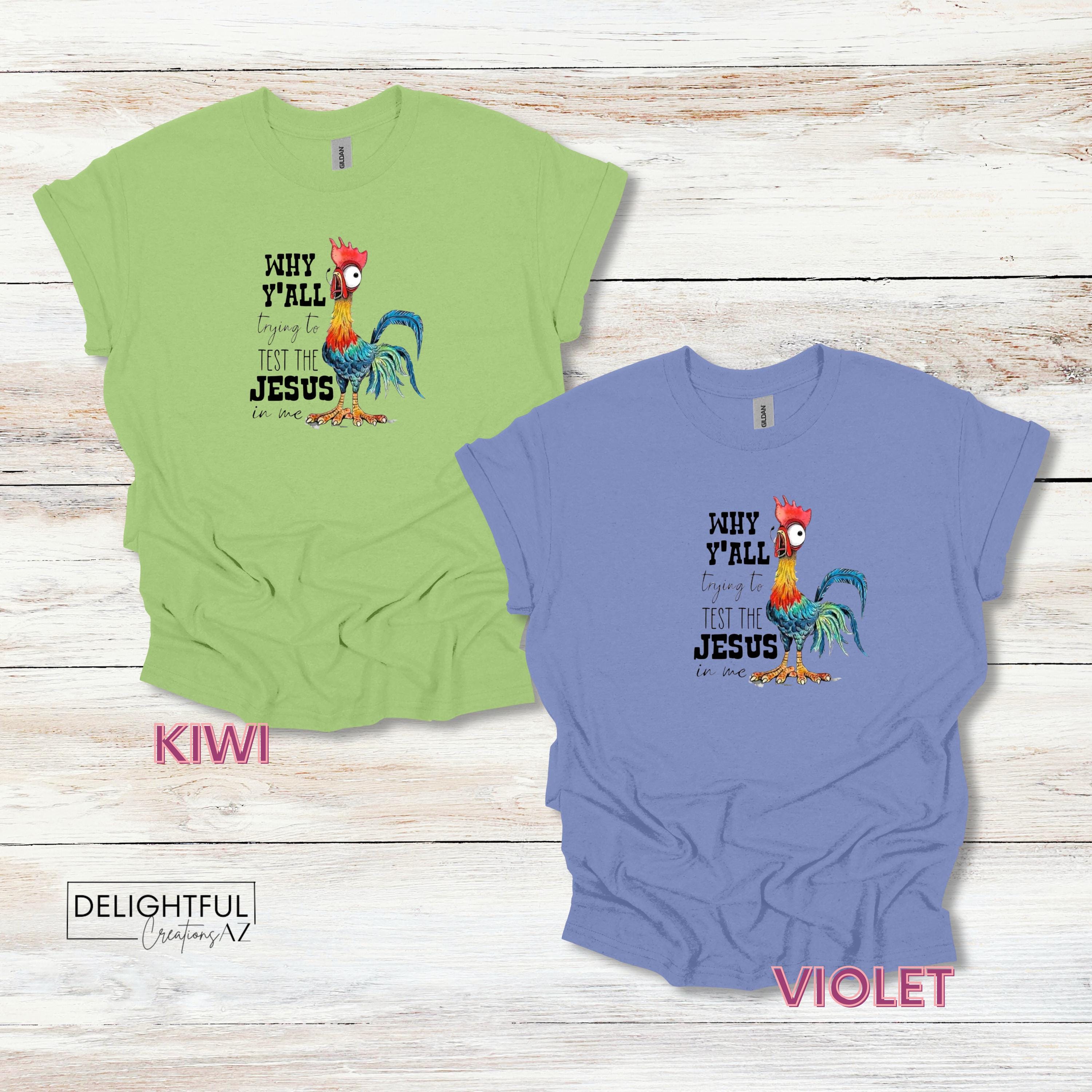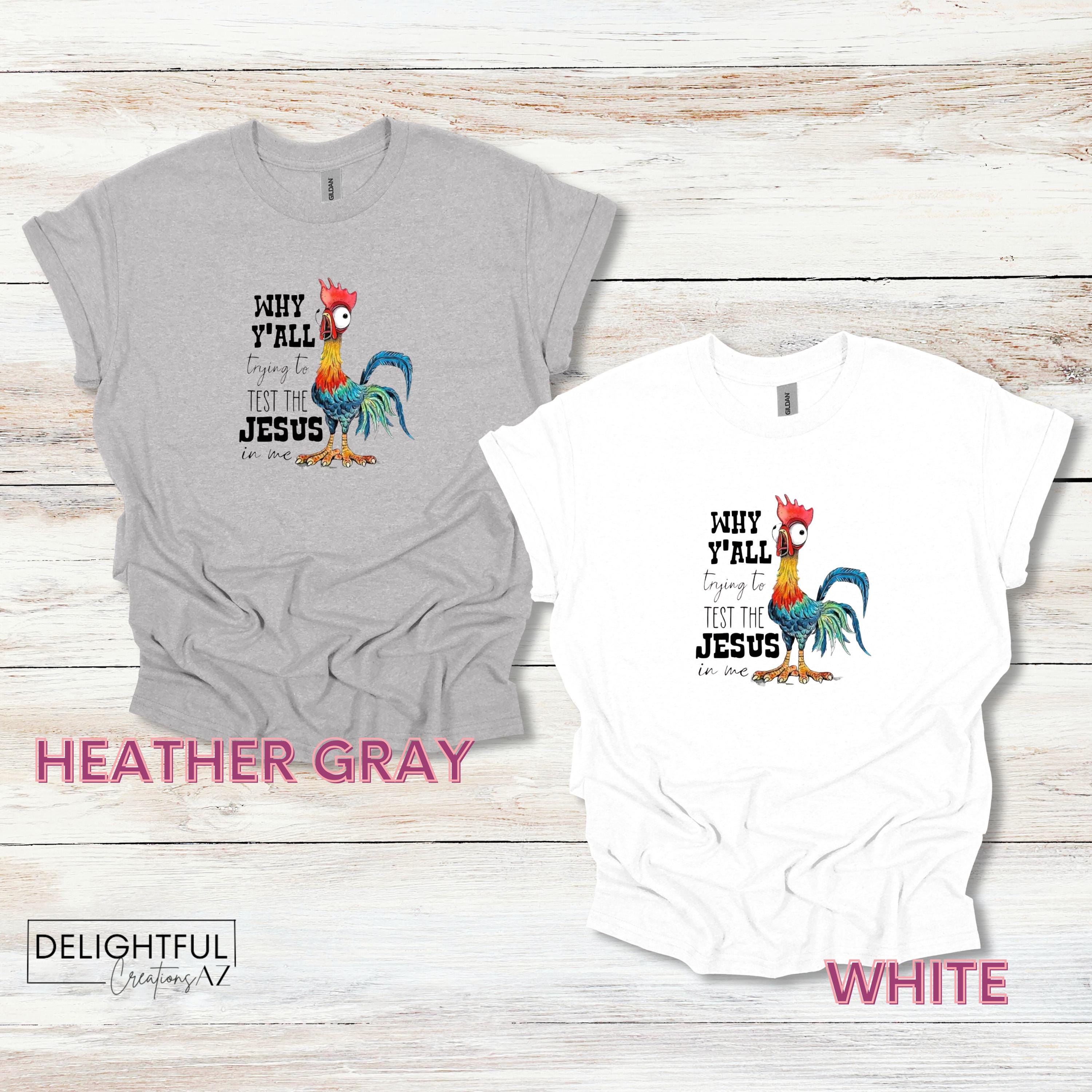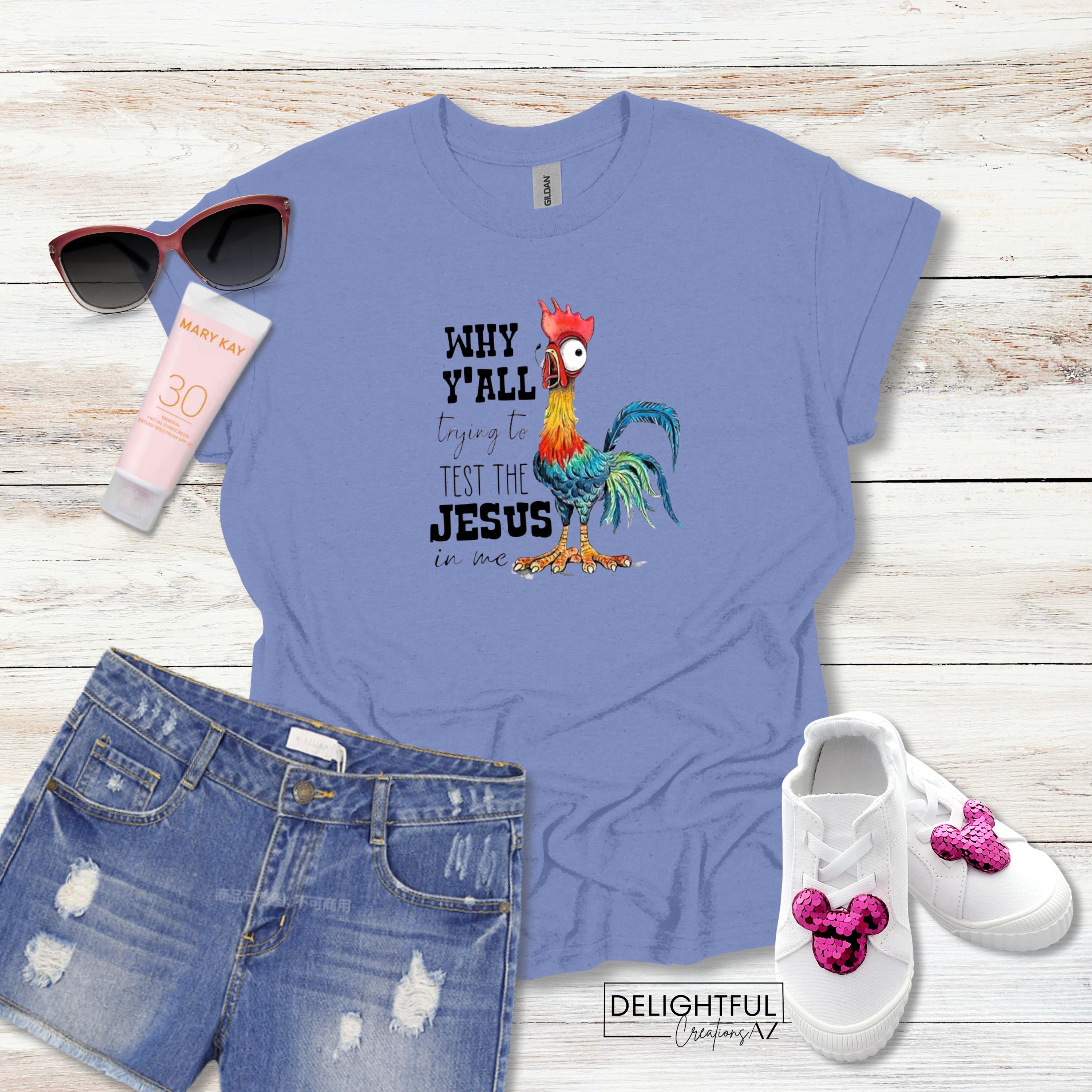 This Hei Hei the Chicken shirt definitely makes a statement. Perfect for the Moana lover. It says "Why y'all trying to test the Jesus in me?" It's a great way to display your sassy & sarcastic side.