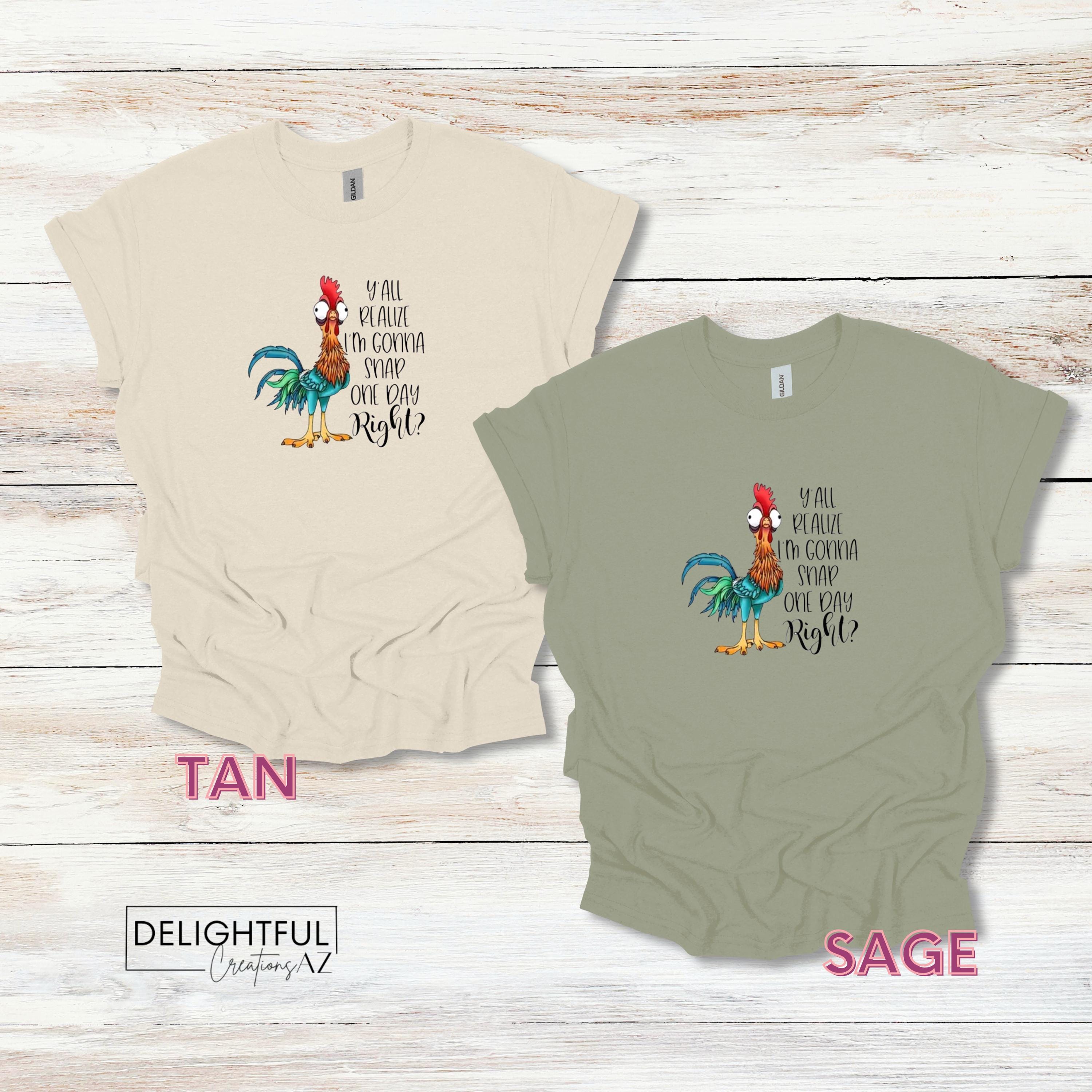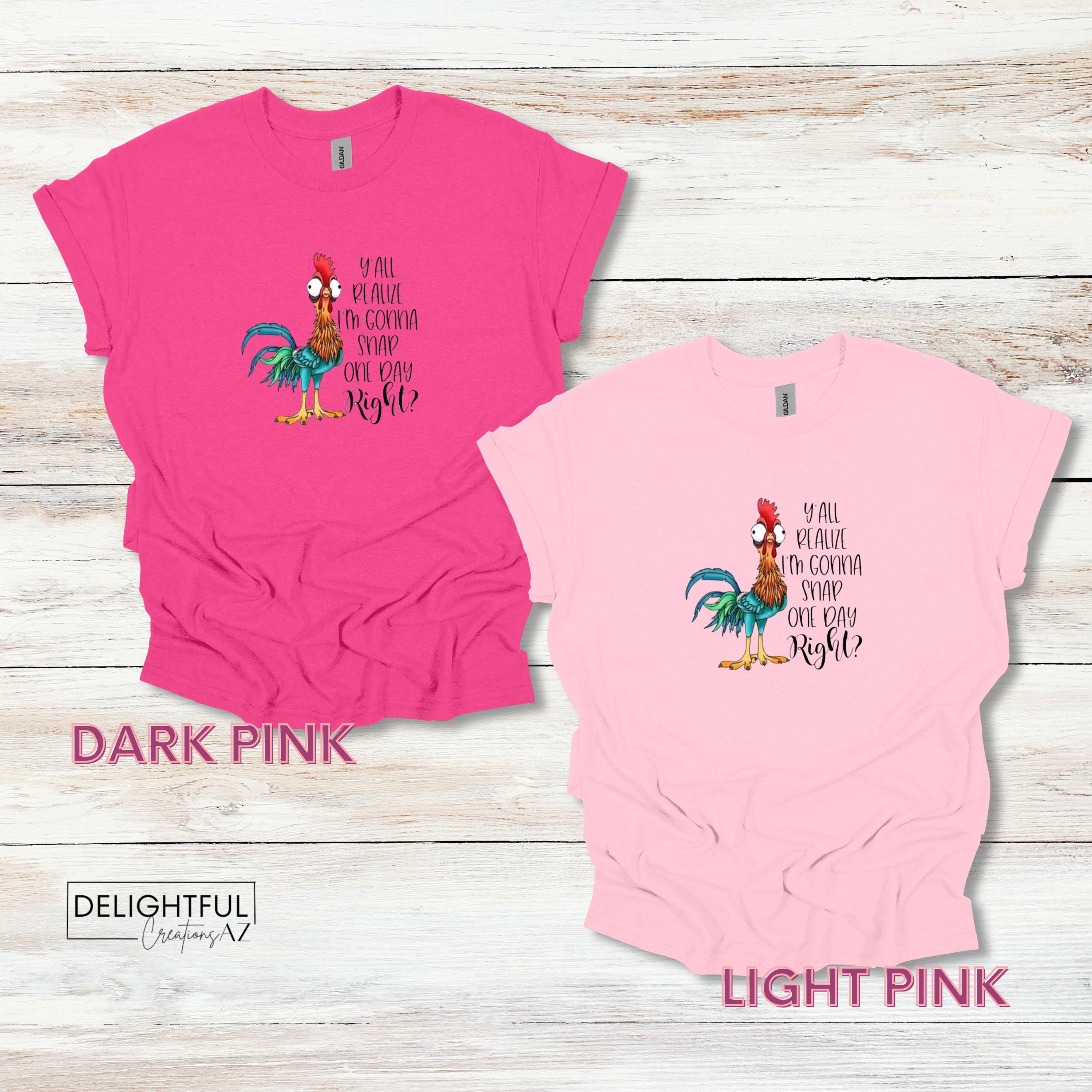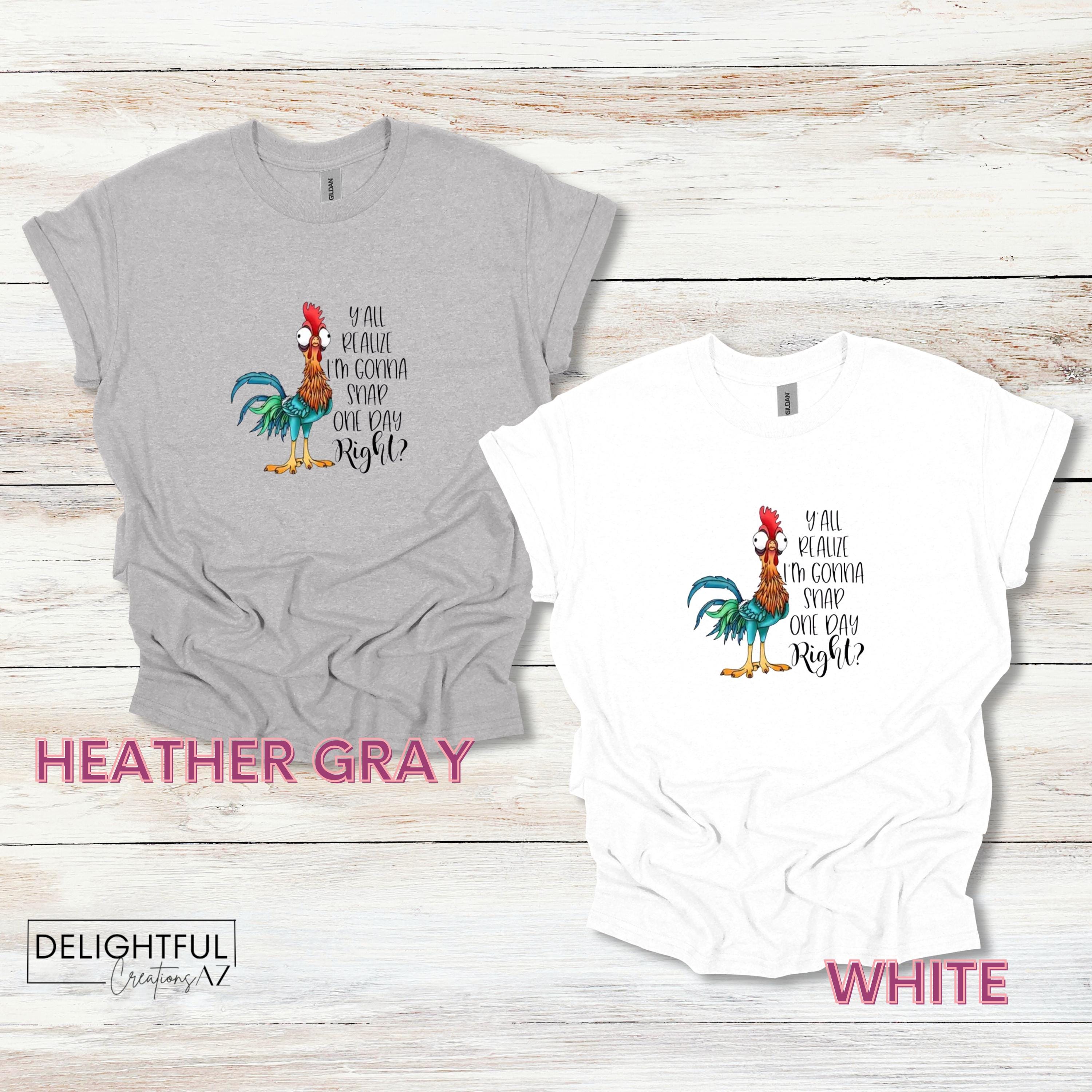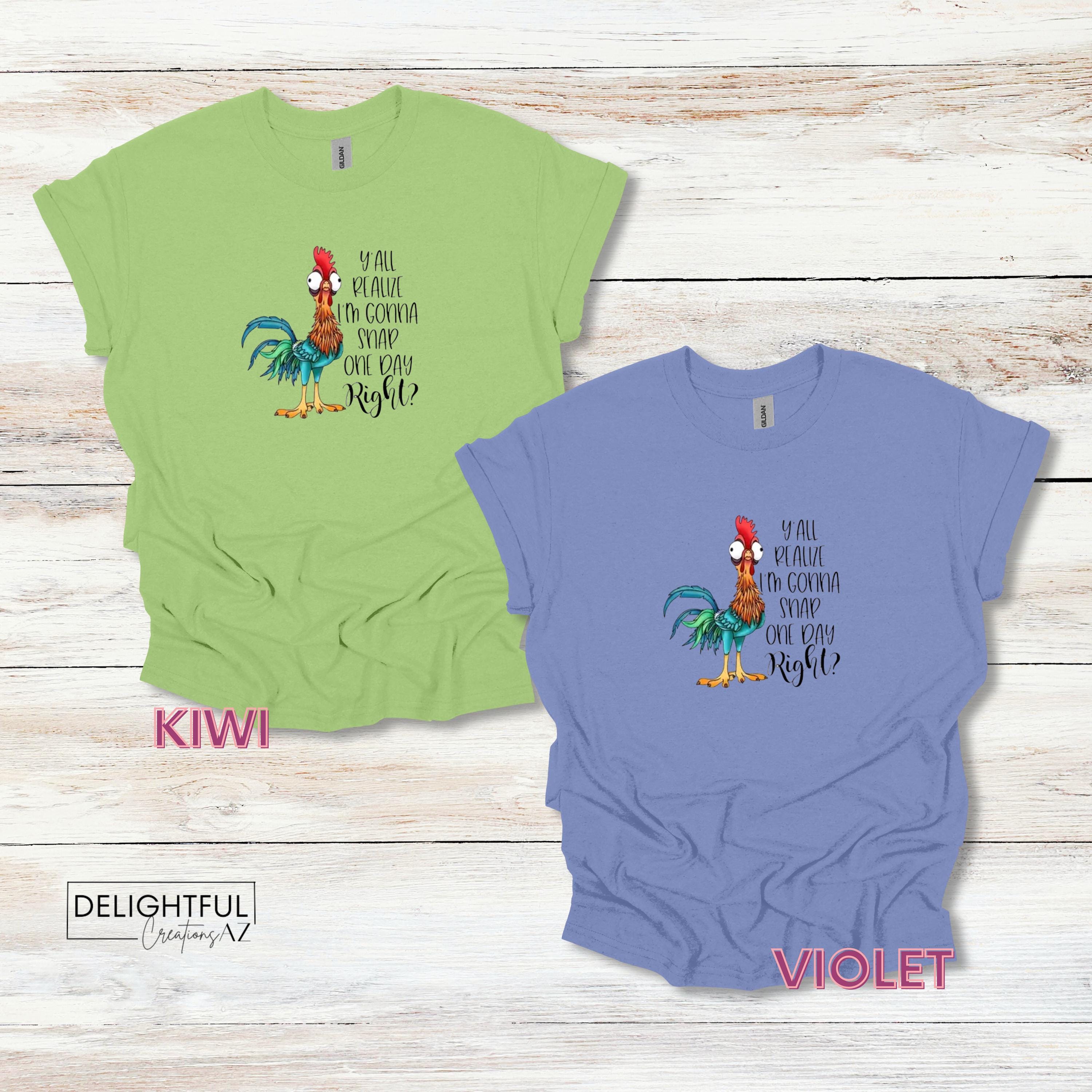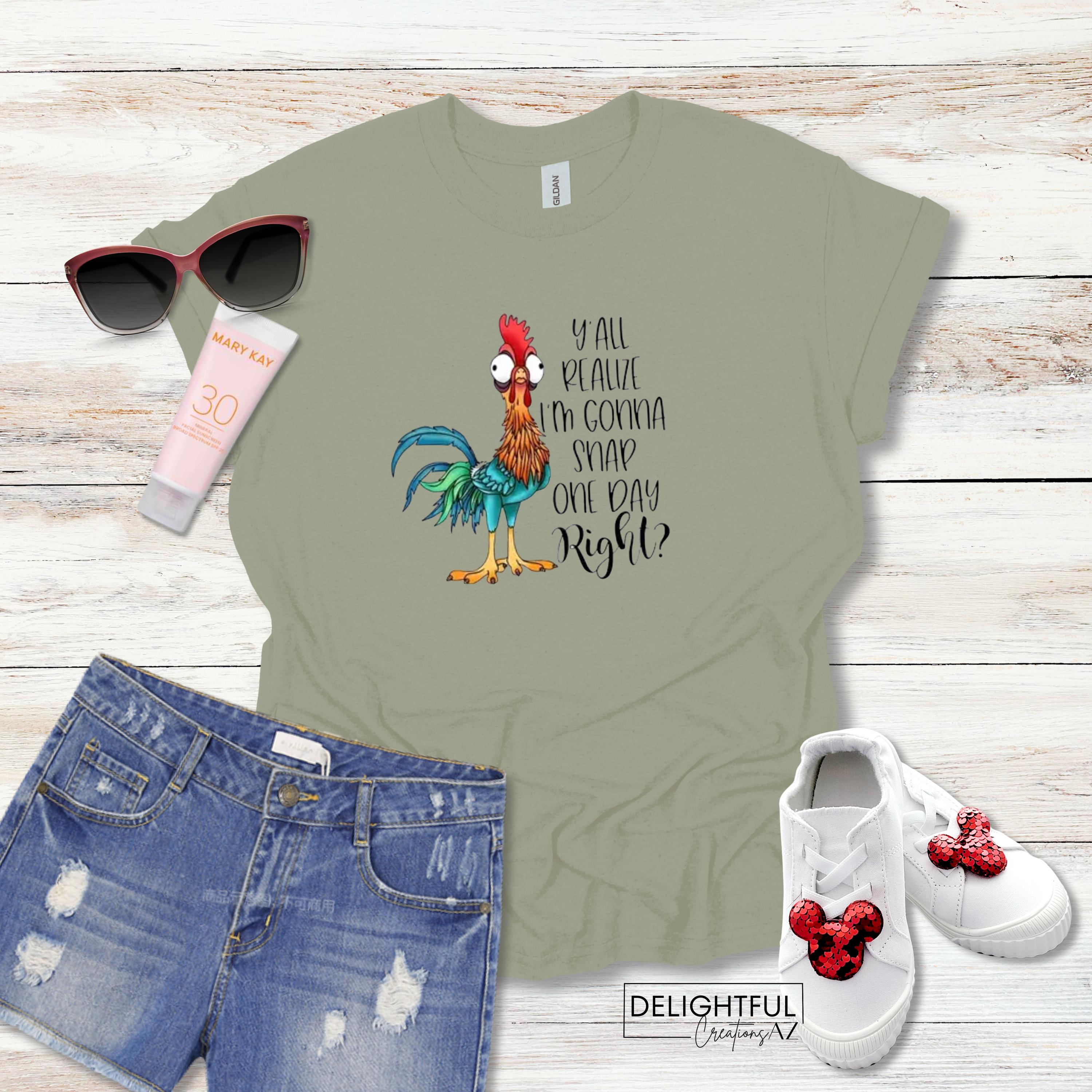 This Hei Hei chicken shirt definitely makes a statement. Prefect for the Moana lover. It says "Y'all realize I'm gonna snap one day, right?" It's a great way to display your sassy & sarcastic side.