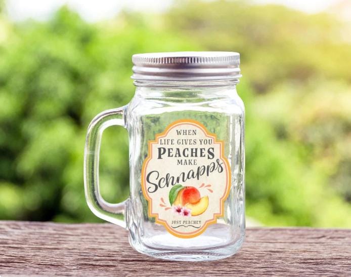 Our "When Life Gives You Peaches Make Schnapps" glass mason jar is a perfect gift! Essential for all your favorite iced coffee, smoothies, and cold drinks! Perfect for sipping your favorite beverages in style. Crafted from high-quality glass, this glassware not only exudes sophistication but also offers a unique way to express yourself. Explore other glass designs at www.delightfulcreationsaz.com