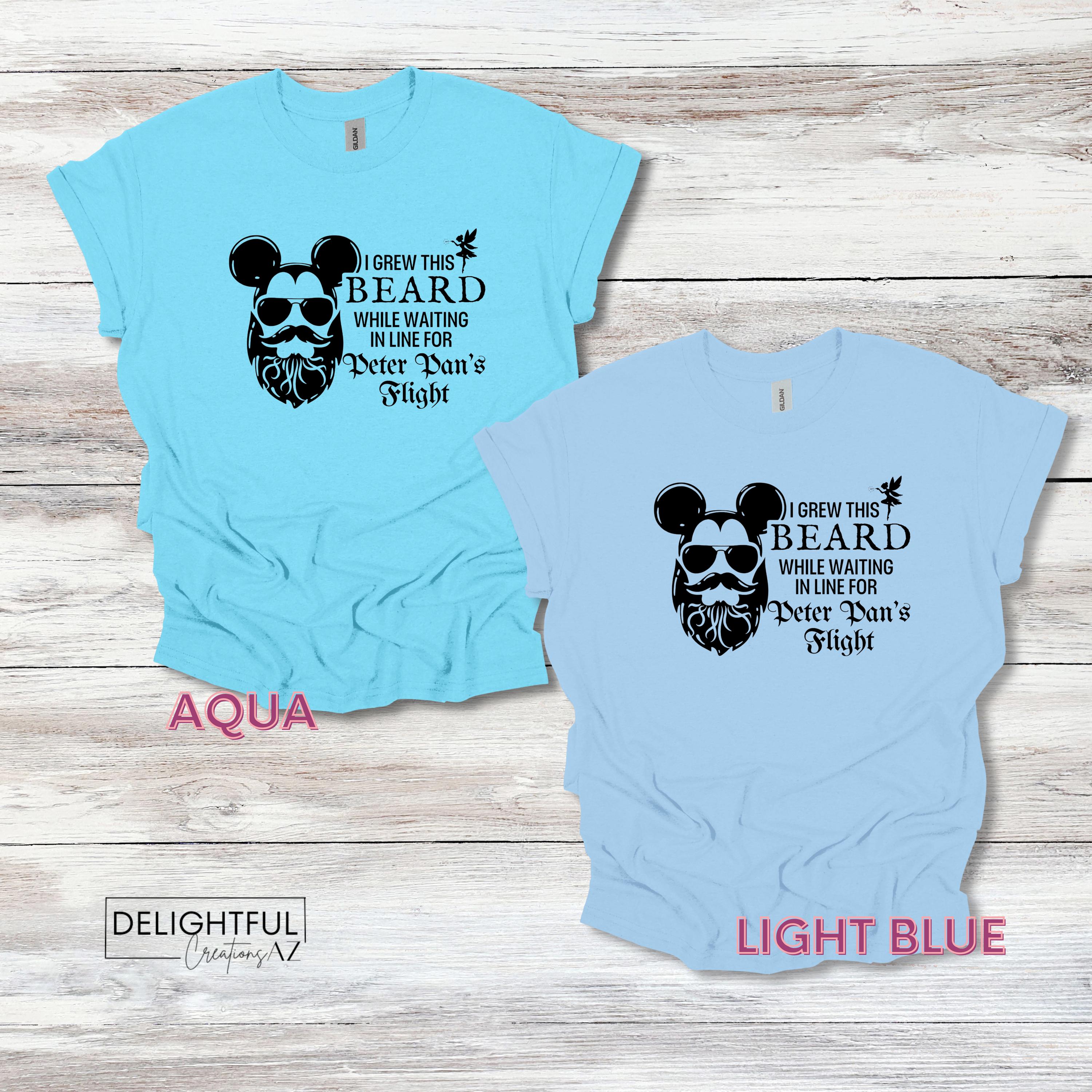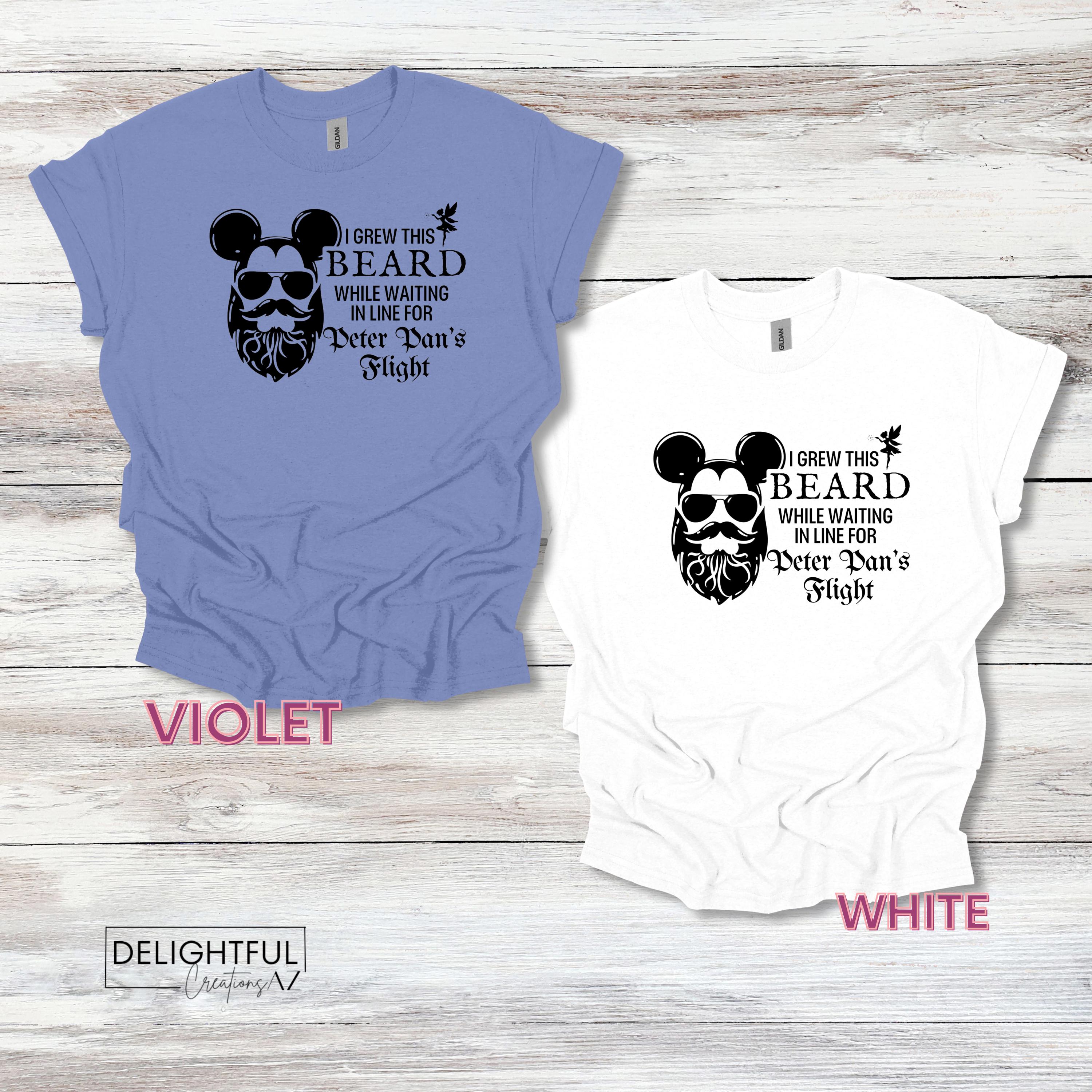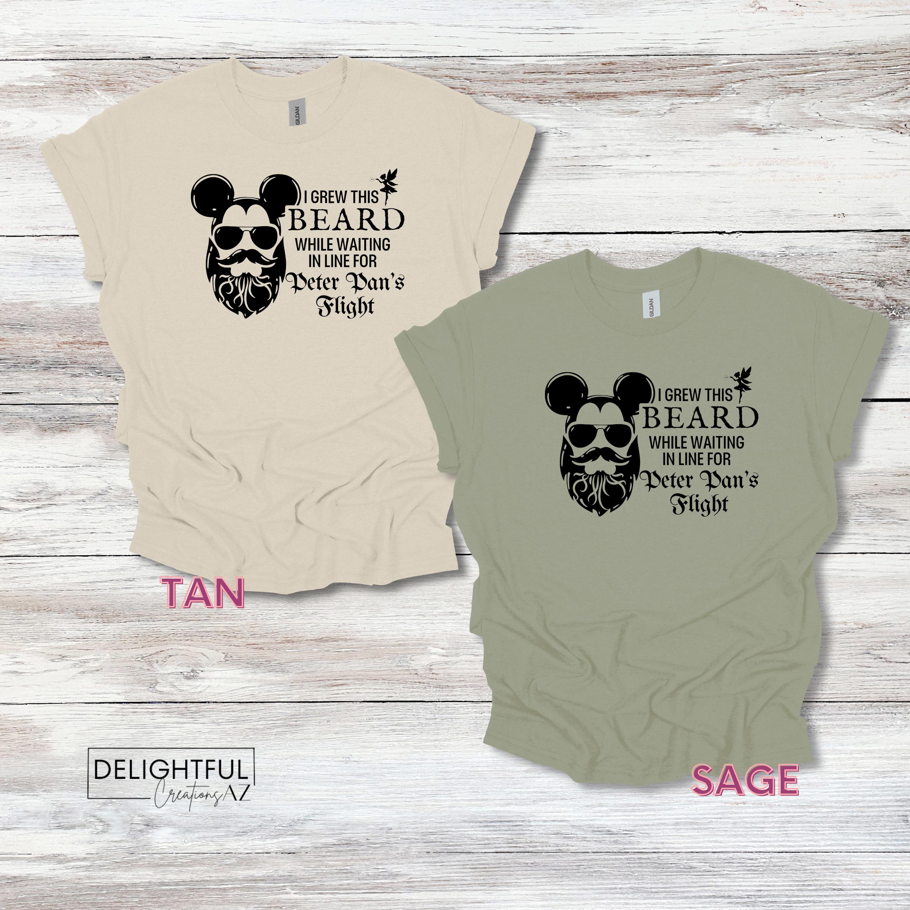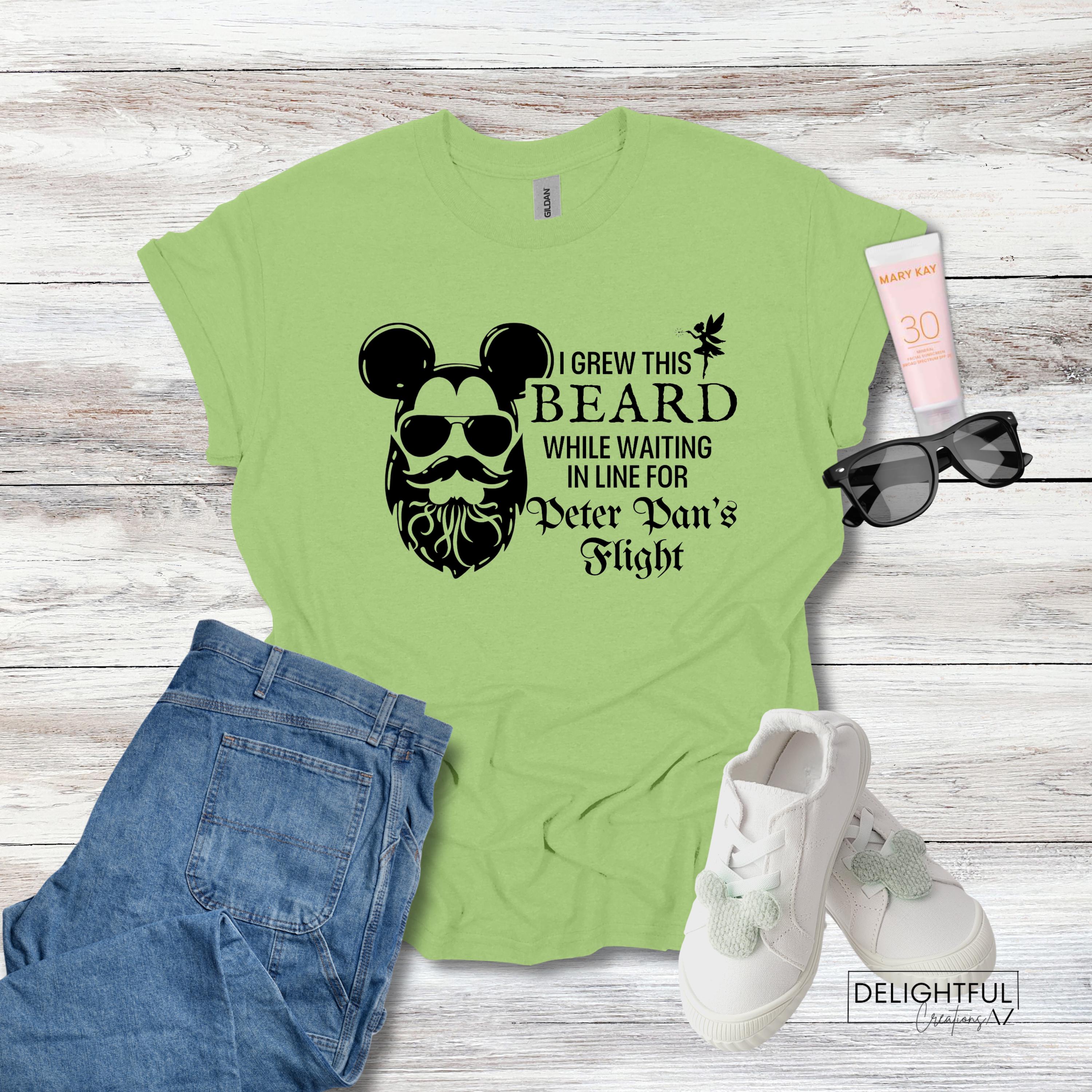 Add some playful humor to your wardrobe with this fun Disney-themed t-shirt! The shirt features a bearded face wearing sunglasses, cleverly combined with Mickey Mouse ears. The text reads, "I GREW THIS BEARD WHILE WAITING IN LINE FOR PETER PAN'S FLIGHT," making it perfect for anyone who has experienced the long lines at Disney parks.