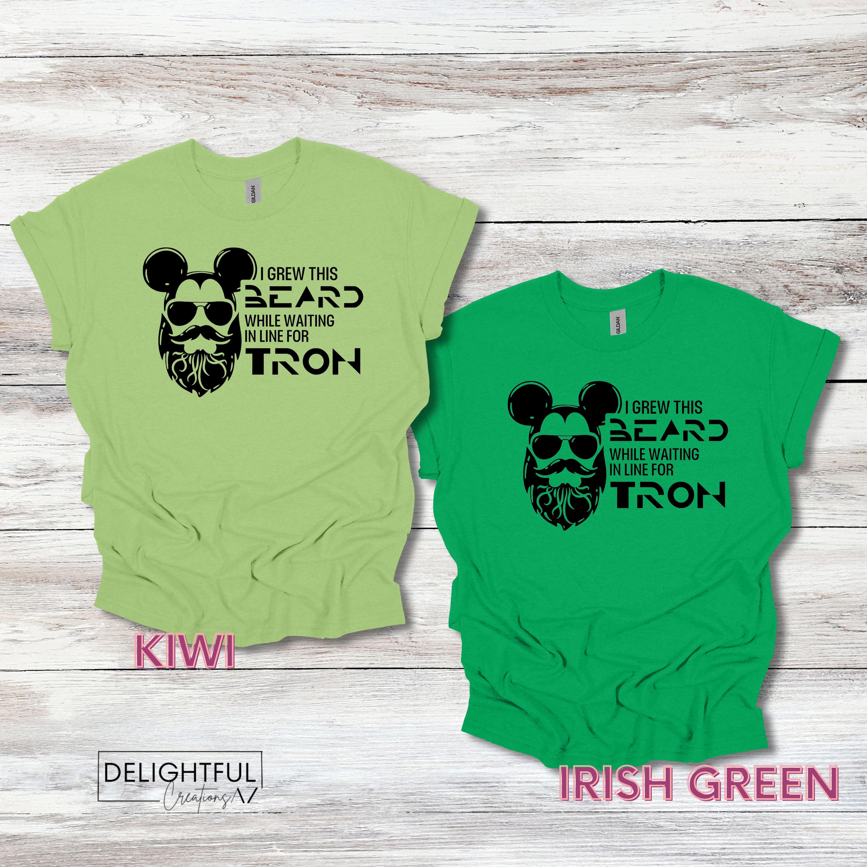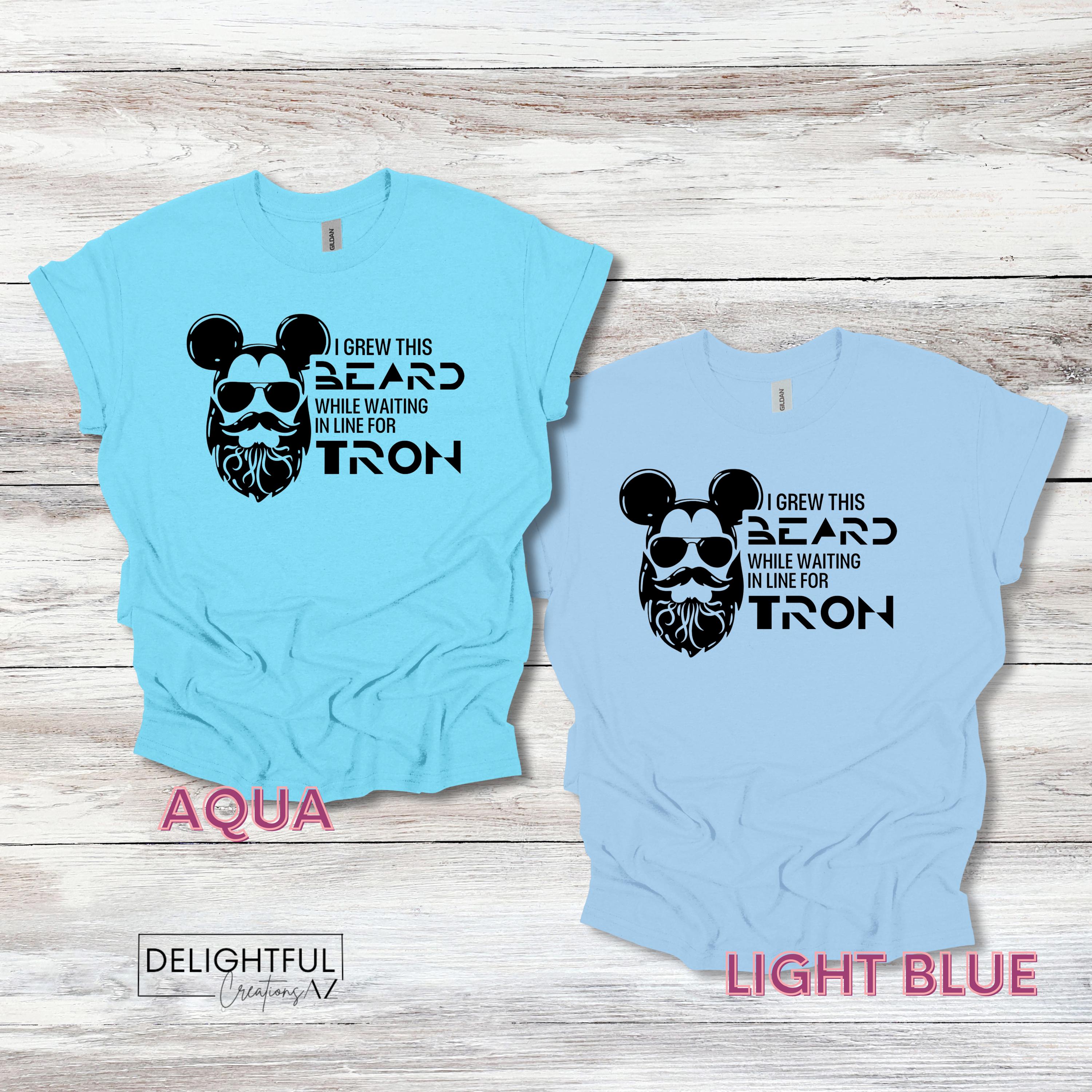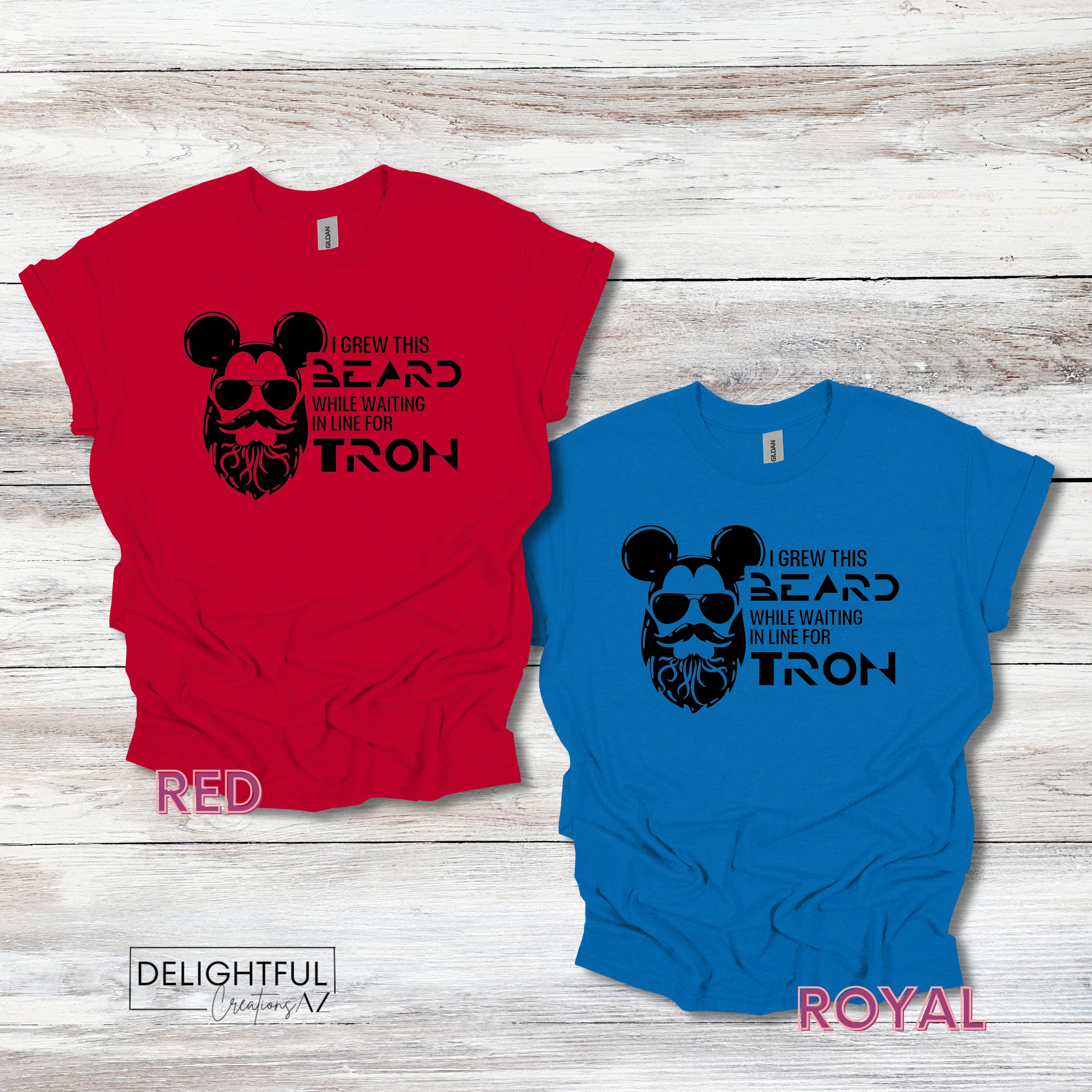 Add some playful humor to your wardrobe with this fun Disney-themed t-shirt! The shirt features a bearded face wearing sunglasses, cleverly combined with Mickey Mouse ears. The text reads, "I GREW THIS BEARD WHILE WAITING IN LINE FOR TRON," making it perfect for anyone who has experienced the long lines at Disney parks.