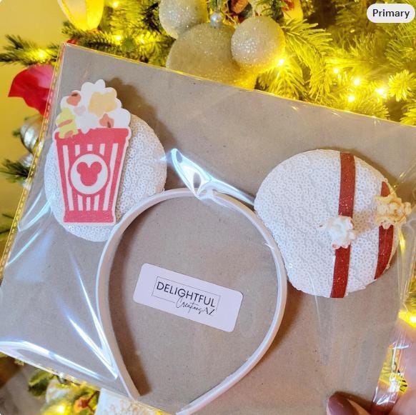 Add flair to your outfit with these charming Mickey inspired ears. Featuring playful popcorn pieces on one ear and a red popcorn bucket on the other, this sequined headband is perfect for park adventures, themed parties, and any day you want a sprinkle of Disney magic. Packaged in clear plastic, it's an eye-catching gift for fans of all ages.