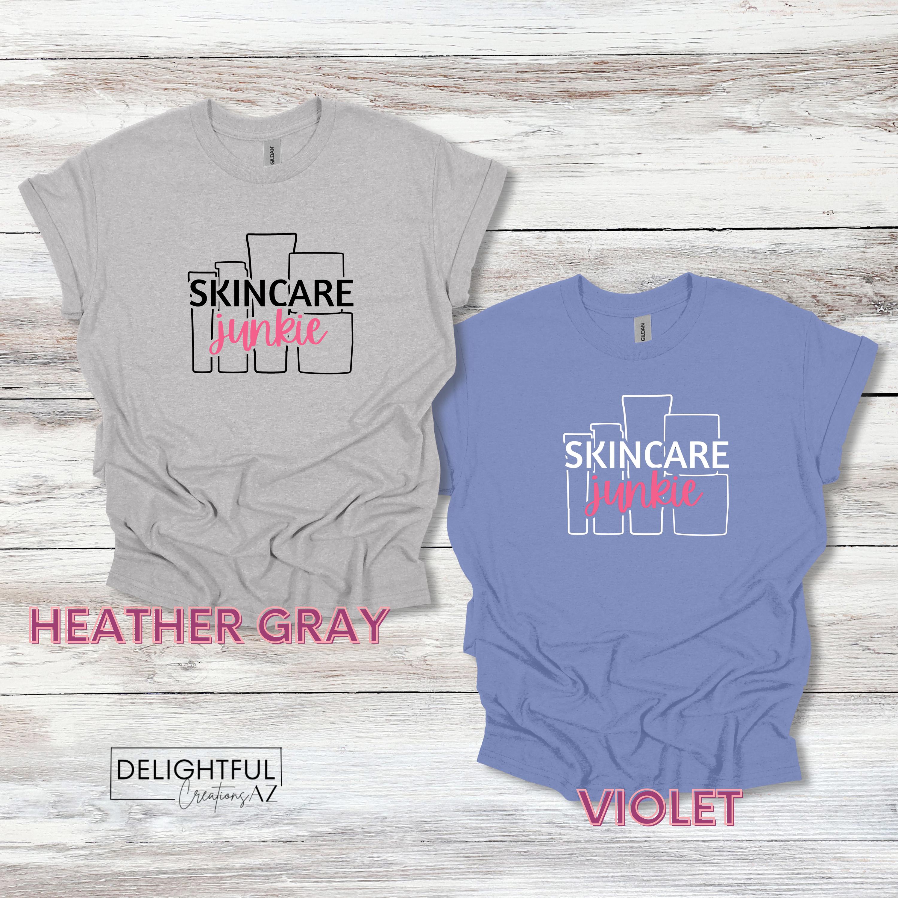 The "Skincare Junkie" T-shirt is perfect for skincare enthusiasts! This stylish tee features a fun design with "Skincare Junkie" in white and pink lettering, integrated with the Mary Kay TimeWise Repair Set product outlines.