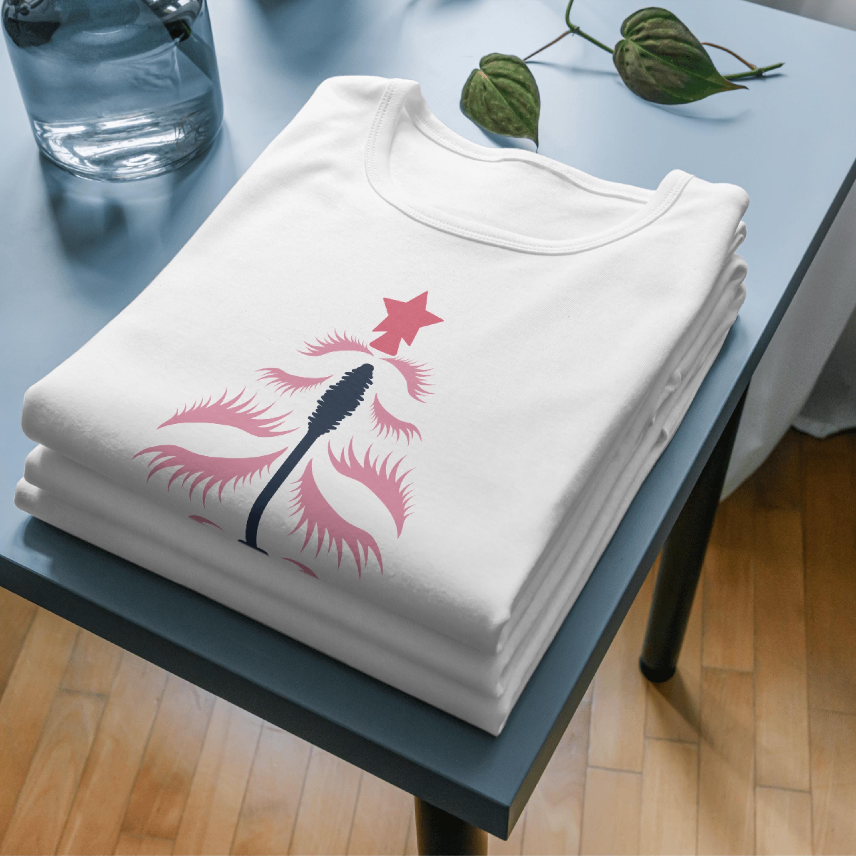 Our Eyelash Christmas Tree T-shirt is the perfect addition to any makeup enthusiast's holiday wardrobe. This stylish tee features a festie design with the batting eyelashes forming a holiday tree.