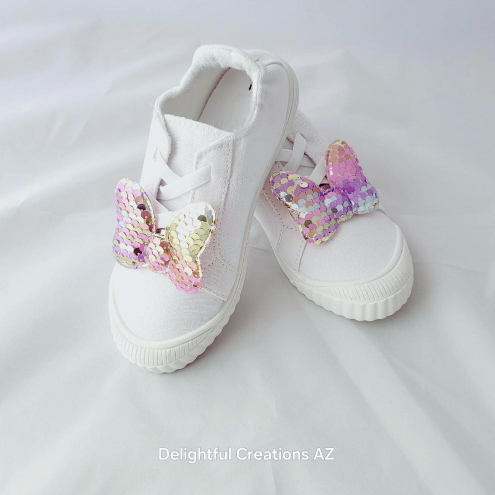 Set of 2. Each clip is approx. 2 inches across and securely attached to a metal shoe clip. Fabric material requires extra care in rain and on water rides. Shoes not included. Explore other designs at www.delightfulcreationsaz.com.