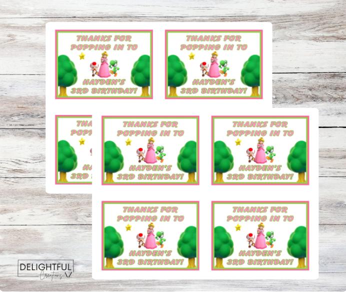 All labels will say "Thanks for popping in to" and the lower portion will be customized for your occasion.
