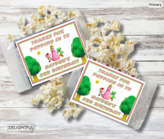 Perfect for any occasion—birthdays, baby showers, and more. Find matching items at www.delightfulcreationsaz.com. *** Popcorn not included. These are not "wraps" but labels that cover the front of the package, leaving nutrition info visible.