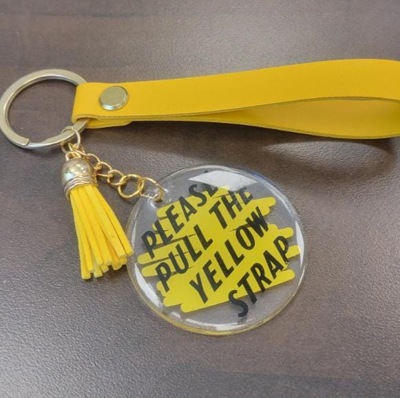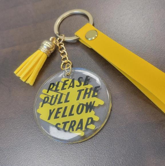 Calling all Disney fans and park-goers! This handmade acrylic keychain is inspired by one of the most iconic instructions you hear before takeoff on your favorite Disney rides. Featuring bold black text over a yellow strap graphic and paired with a real yellow strap key fob, this accessory is perfect for Soarin' lovers, thrill-seekers, and magic-makers alike.