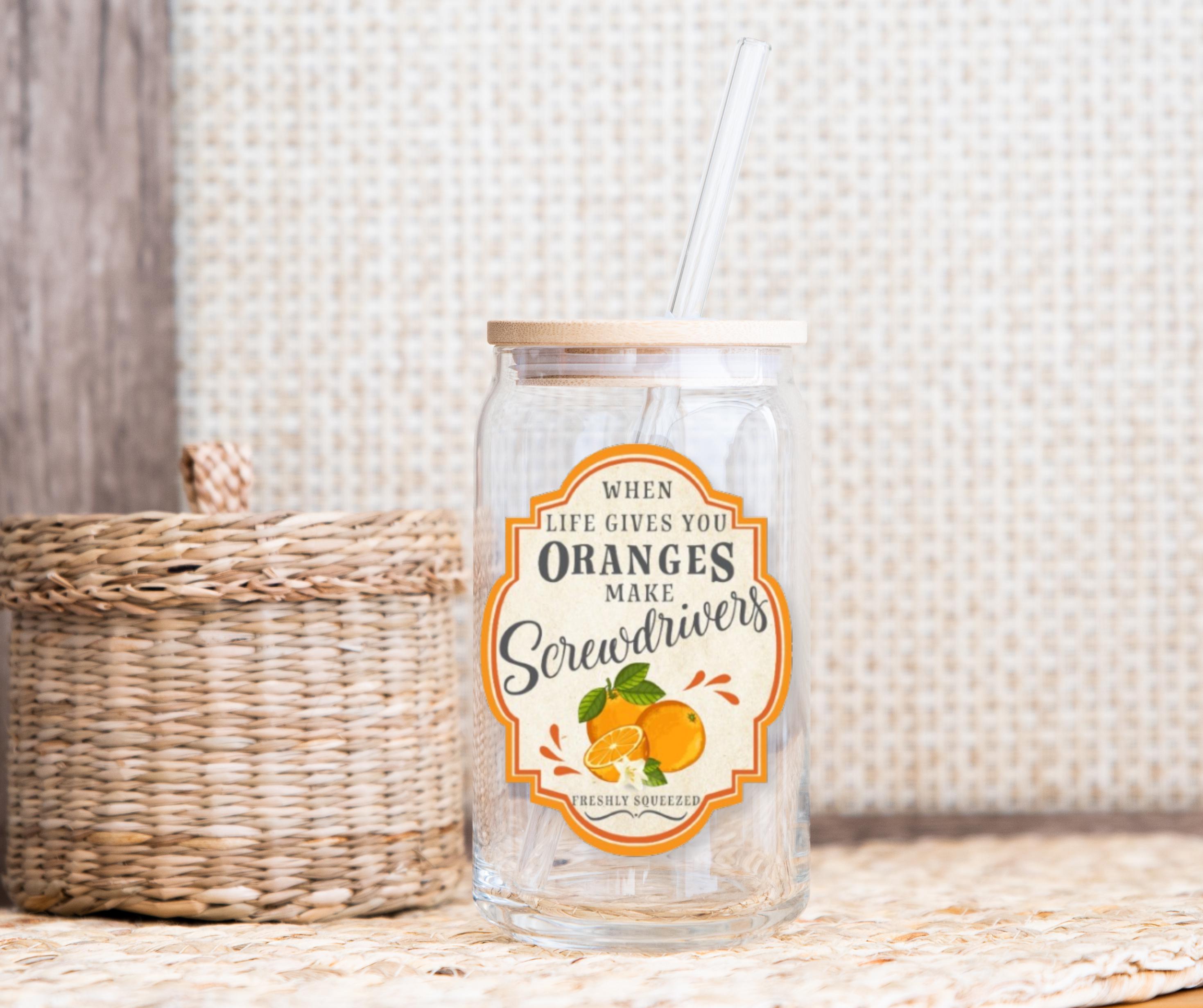 Our "When Life Gives You Orangees Make Screwdrivers" glass cup is a perfect gift! Essential for all your favorite iced coffee, smoothies, and cold drinks! Perfect for sipping your favorite beverages in style. Crafted from high-quality glass, this glassware not only exudes sophistication but also offers a unique way to express yourself. Explore other glass designs at www.delightfulcreationsaz.com