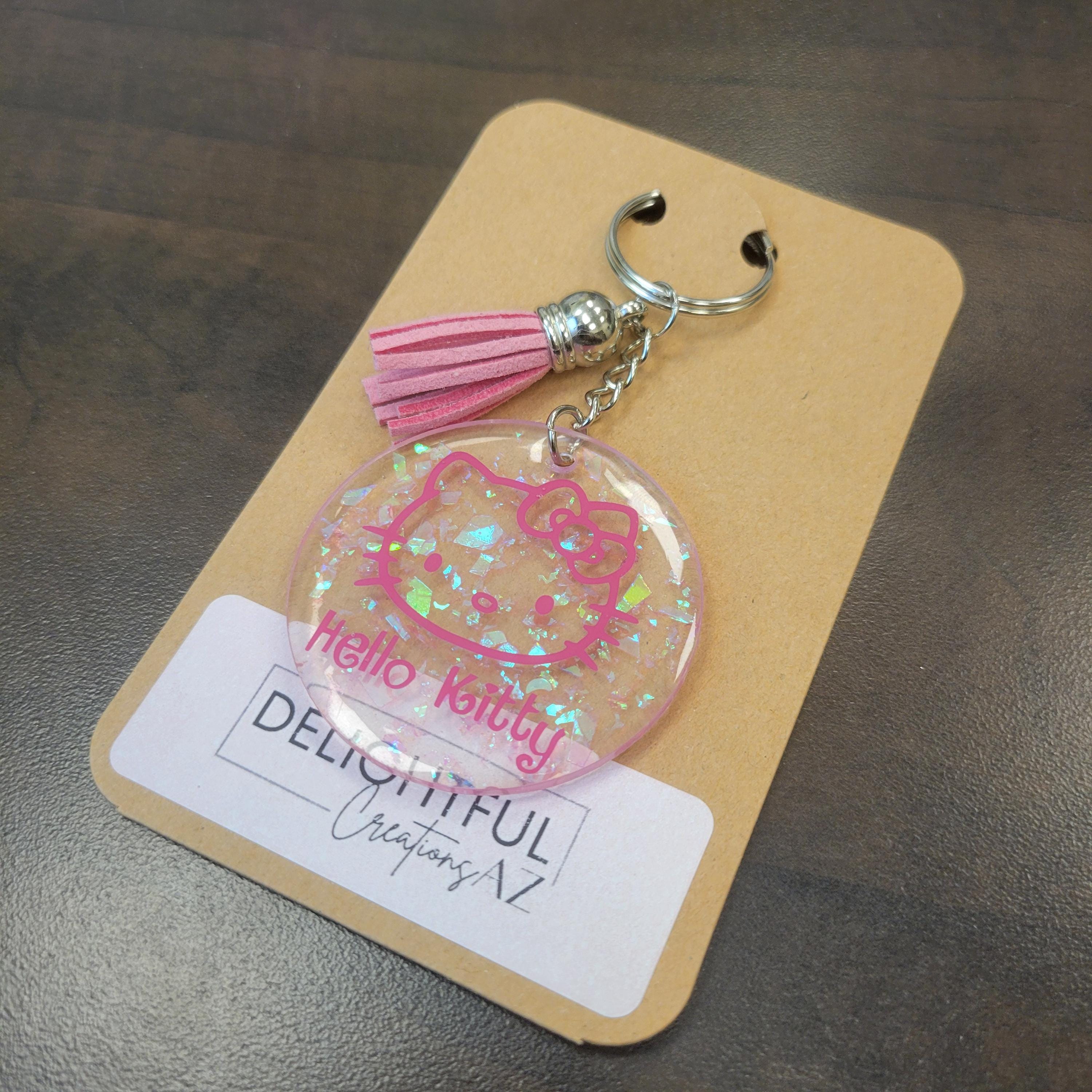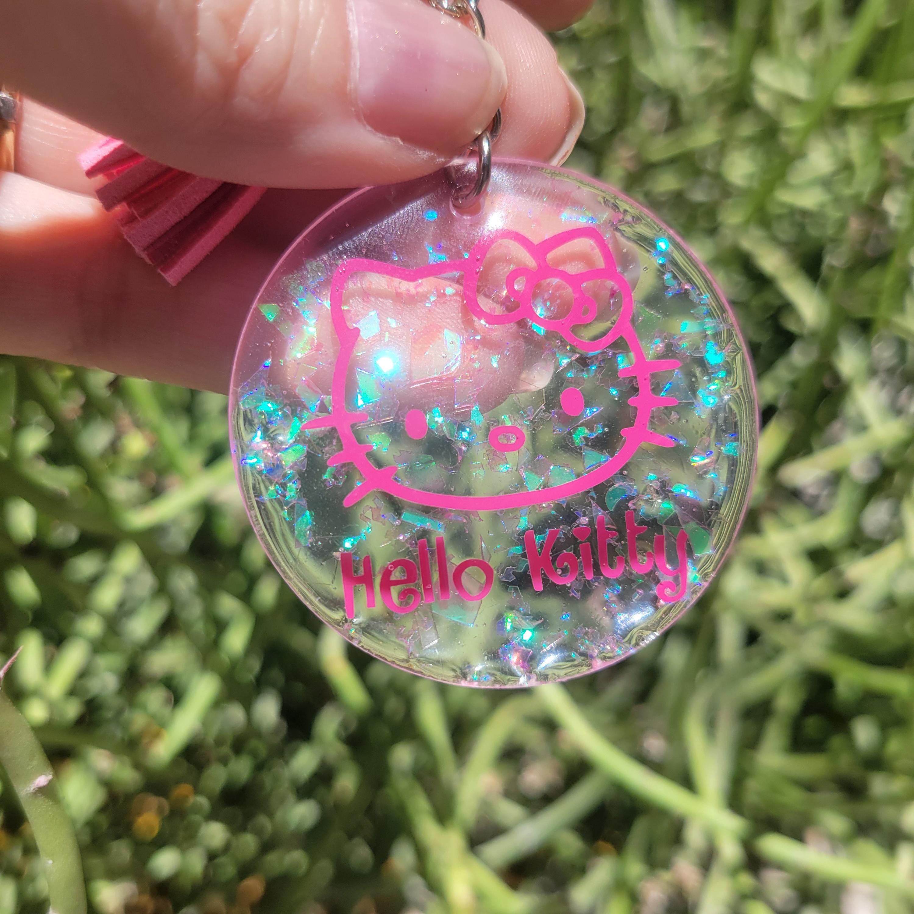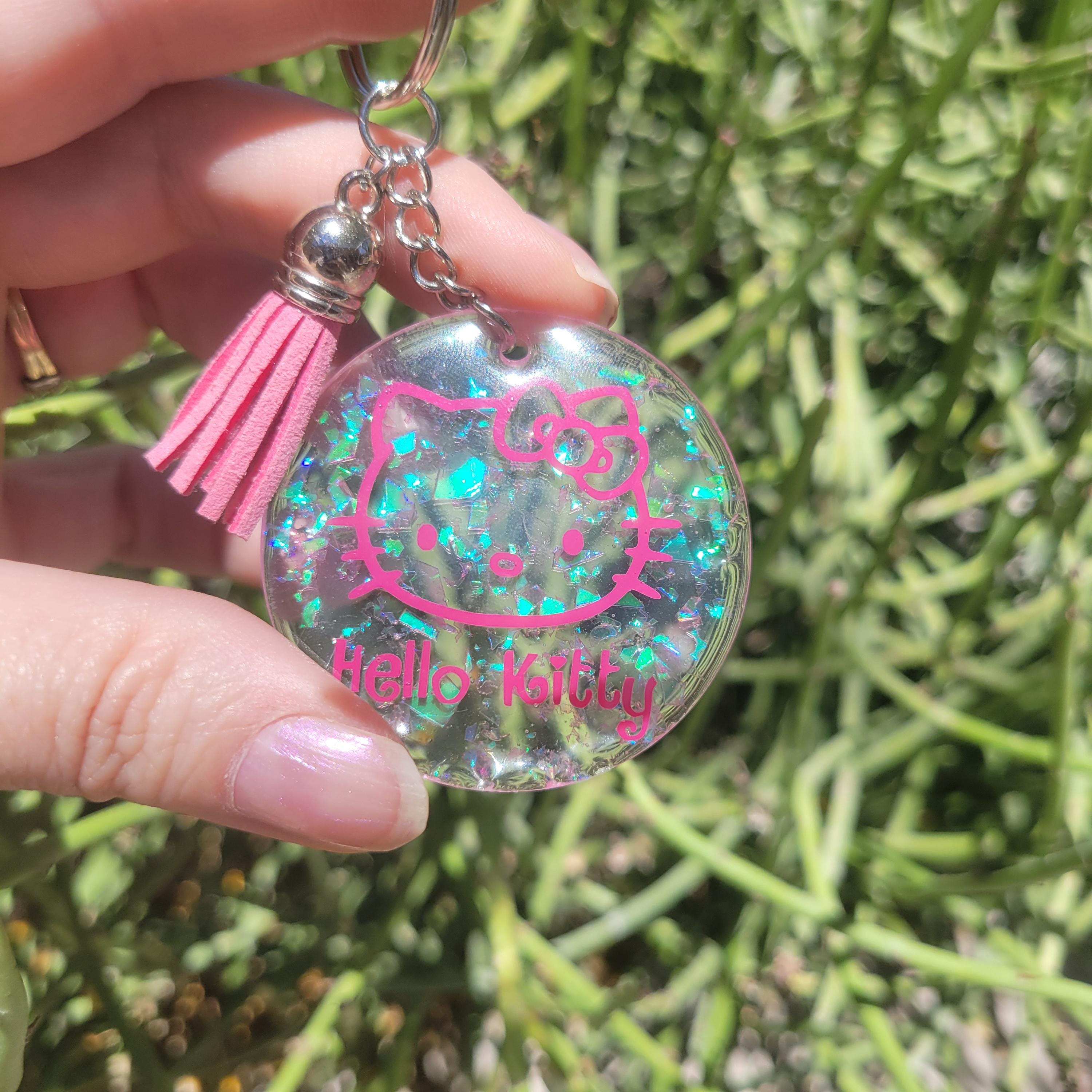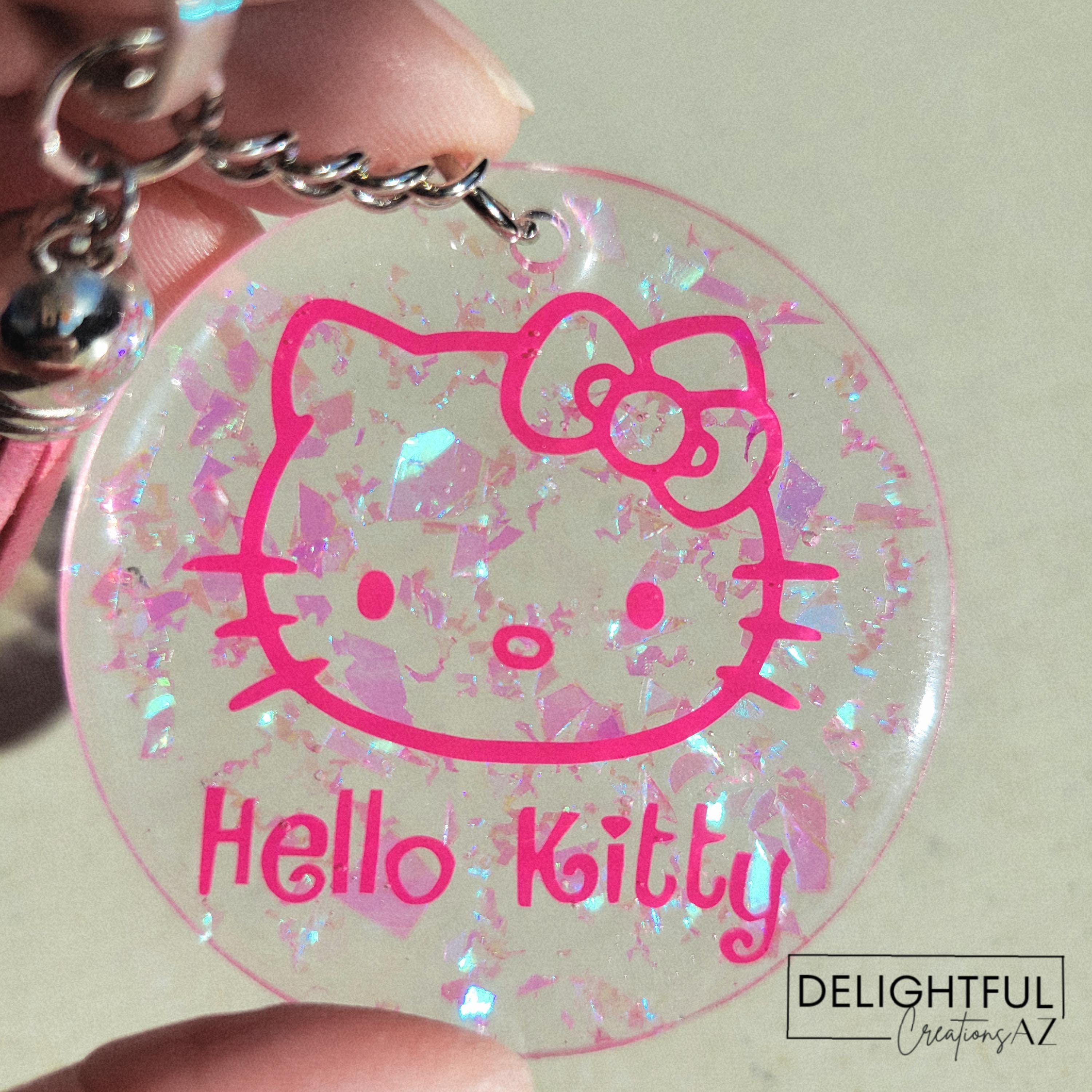 This handmade Hello Kitty keychain is more than just cute—it's a glittery reminder that sweetness and strength go hand in hand. Featuring Hello Kitty’s iconic face outlined in pink, nestled in a swirl of iridescent flakes, and finished with a playful pink tassel, it’s perfect for anyone who needs a dose of joy on the go.