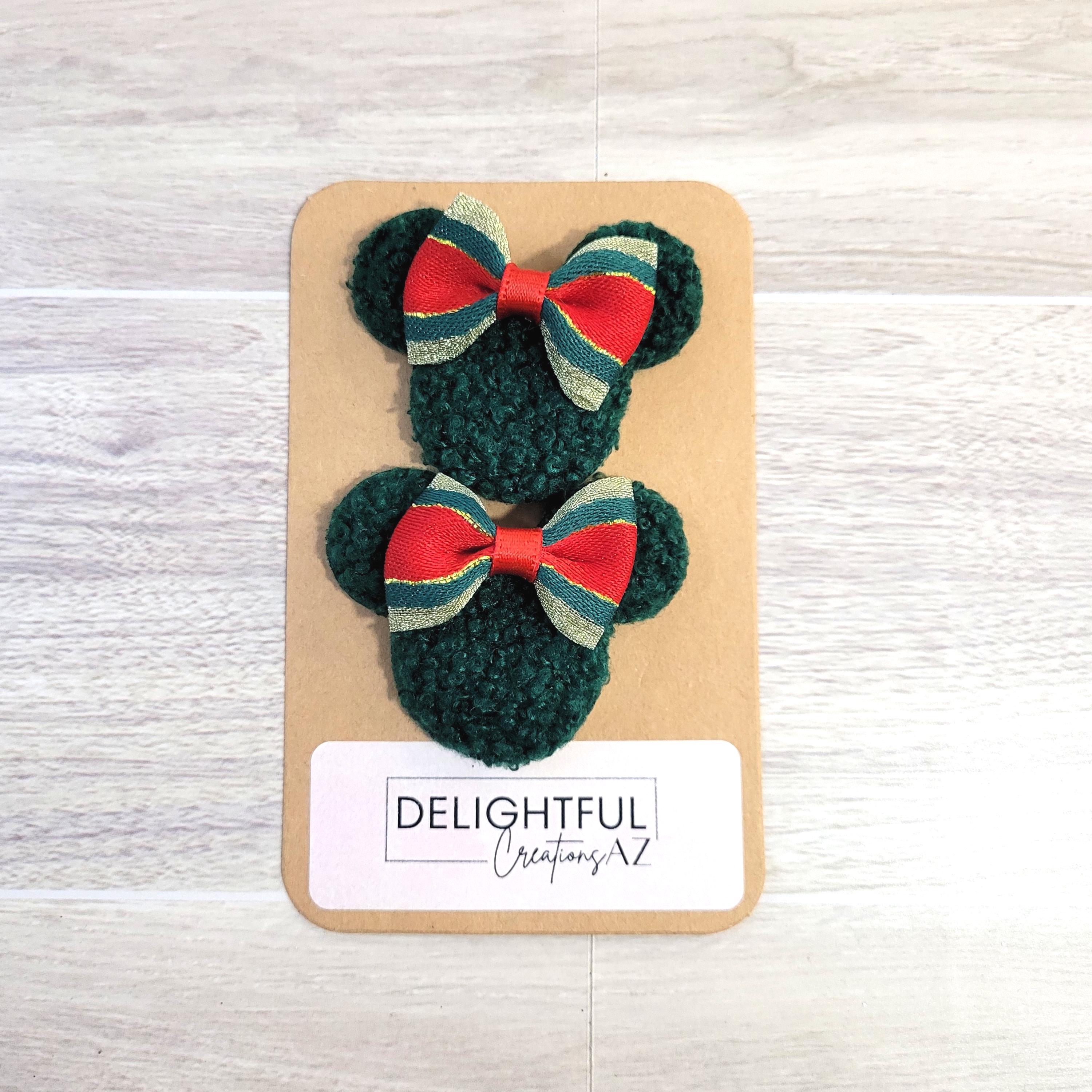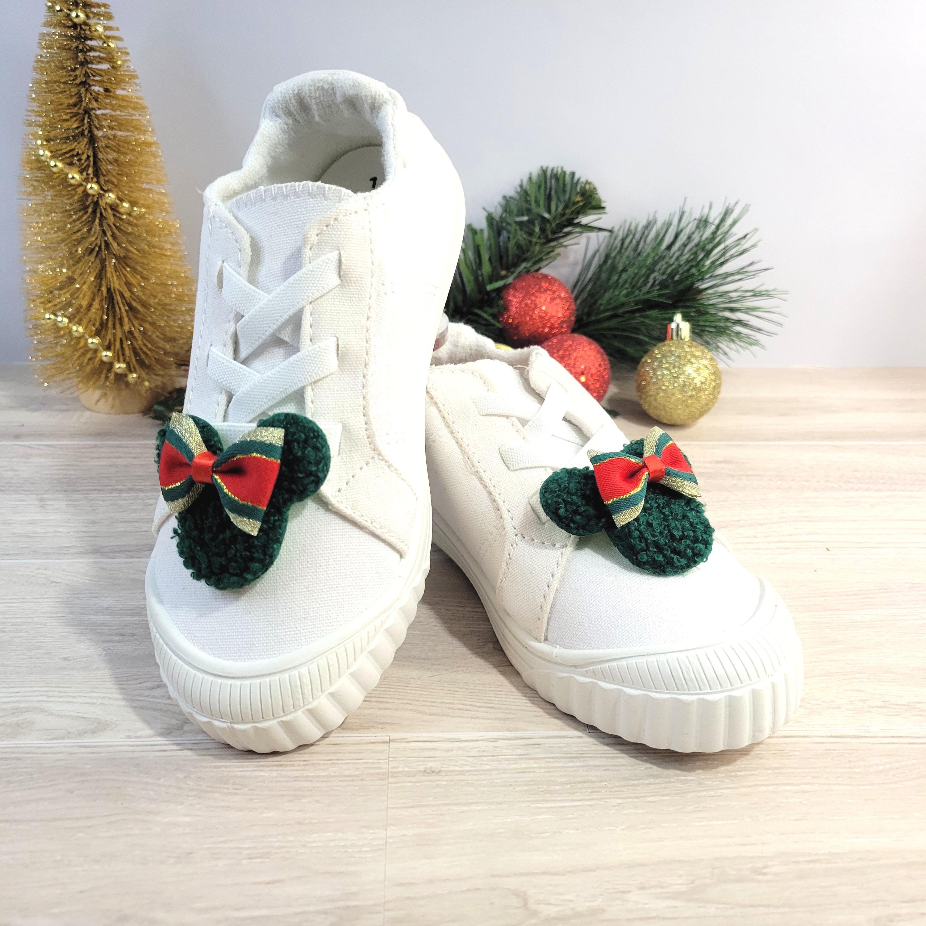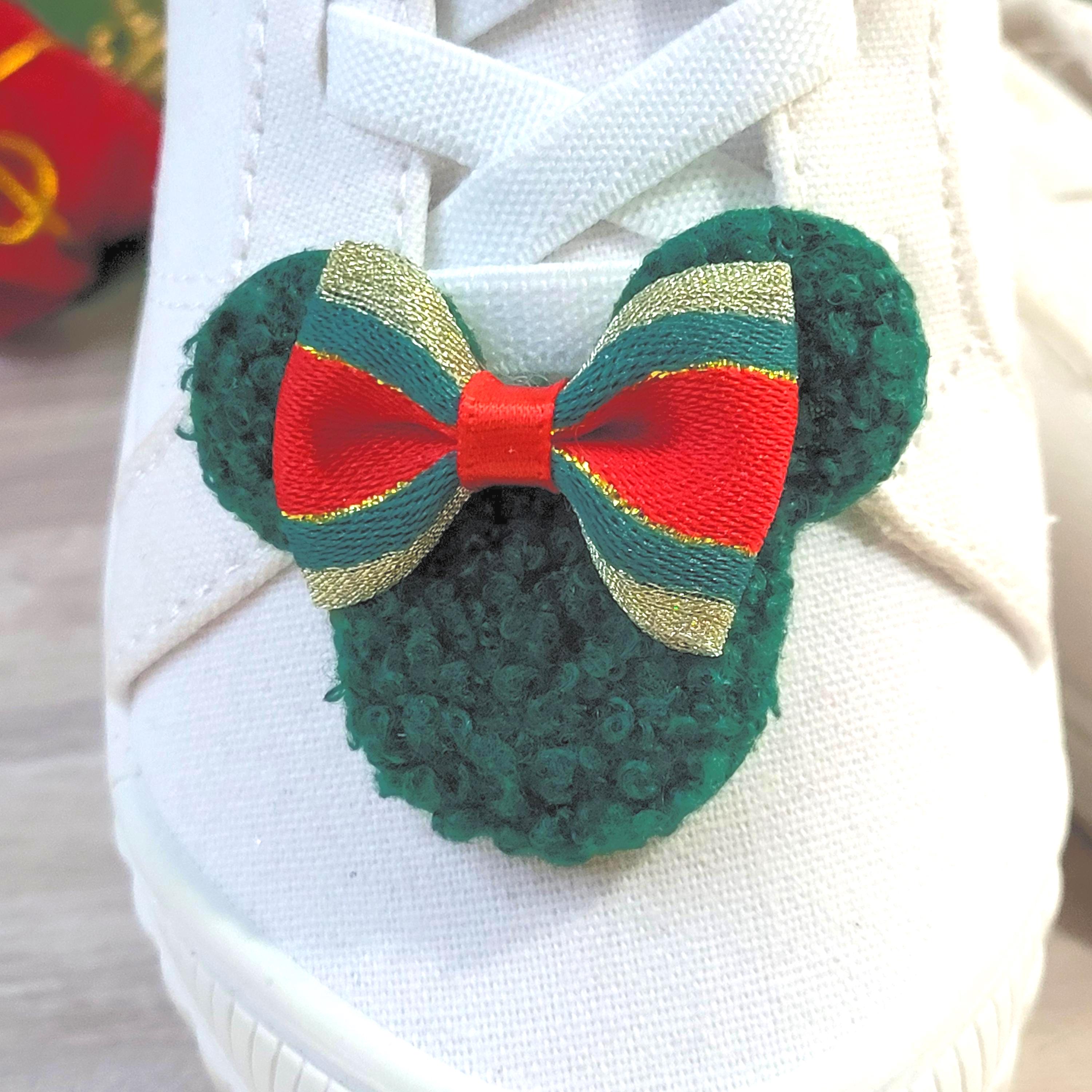 Add a touch of holiday cheer to your kicks with these festive green Mickey-inspired shoe clips! Each clip features plush mouse ears topped with a gold, red and green striped bow—perfect for park strolls, holiday parties, or just spreading seasonal joy wherever you go. Handmade with love and securely fastened to metal clips, they’re a whimsical way to dress up your sneakers with Disney charm. Limited quantities available, so grab your pair before they dash away like reindeer on Christmas Eve!