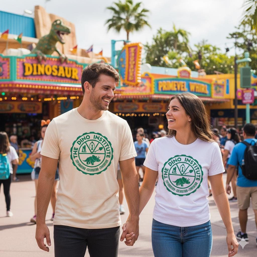 Step into the world of prehistory and adventure with The Dino Institute T-Shirt, the perfect apparel for every lover of the now extinct Dinoland USA! Inspired by the iconic attraction at Disney’s Animal Kingdom, this comfortable, short-sleeve tee features the distinctive circular logo complete with a triceratops silhouette and essential archaeological tools. Whether you're navigating the DINOSAUR ride, grabbing a quick bite at Restaurantosaurus, or planning your group's matching outfits, this shirt is a must-have park souvenir that captures the spirit of exploration and prehistoric fun.