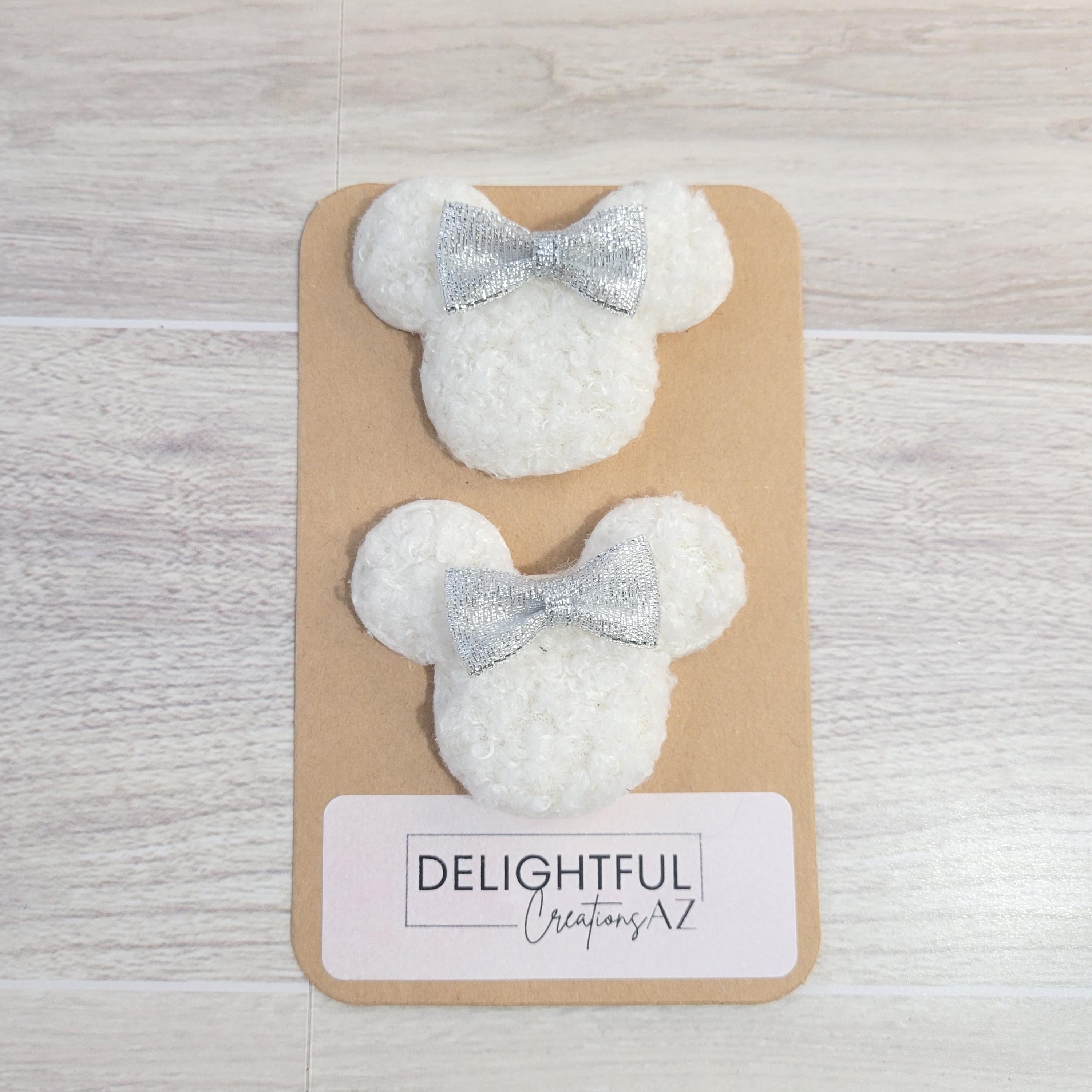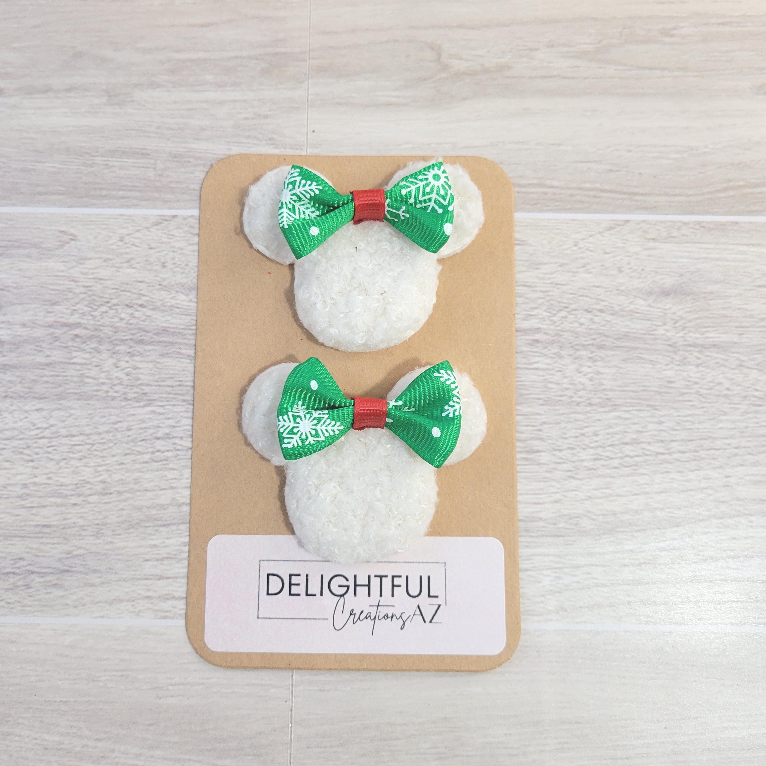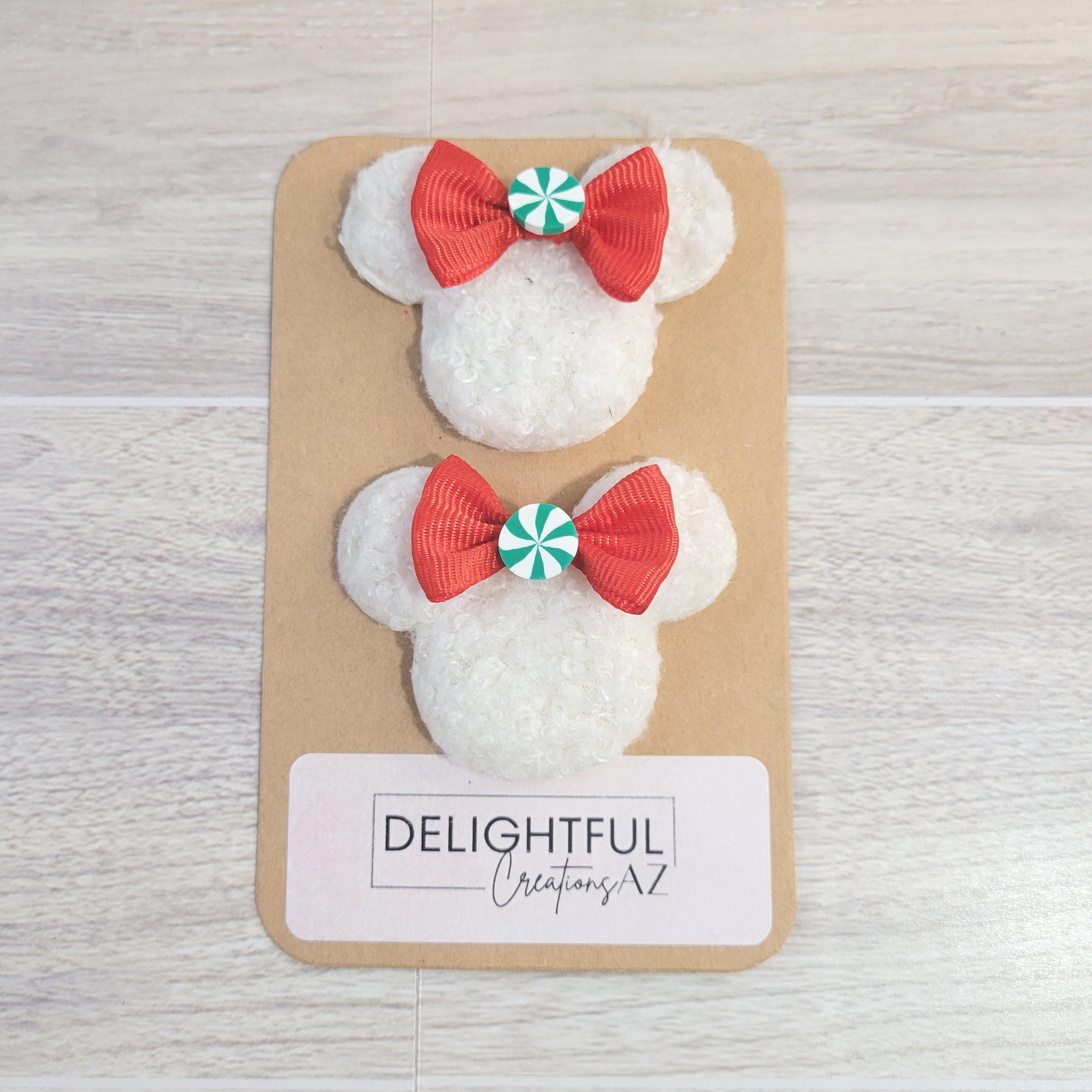 Add a touch of holiday cheer to your kicks with these festive white Mickey-inspired shoe clips! Each clip features plush mouse ears topped with a your choice of festive bow—perfect for park strolls, holiday parties, or just spreading seasonal joy wherever you go. Handmade with love and securely fastened to metal clips, they’re a whimsical way to dress up your sneakers with Disney charm. Limited quantities available, so grab your pair before they dash away like reindeer on Christmas Eve!