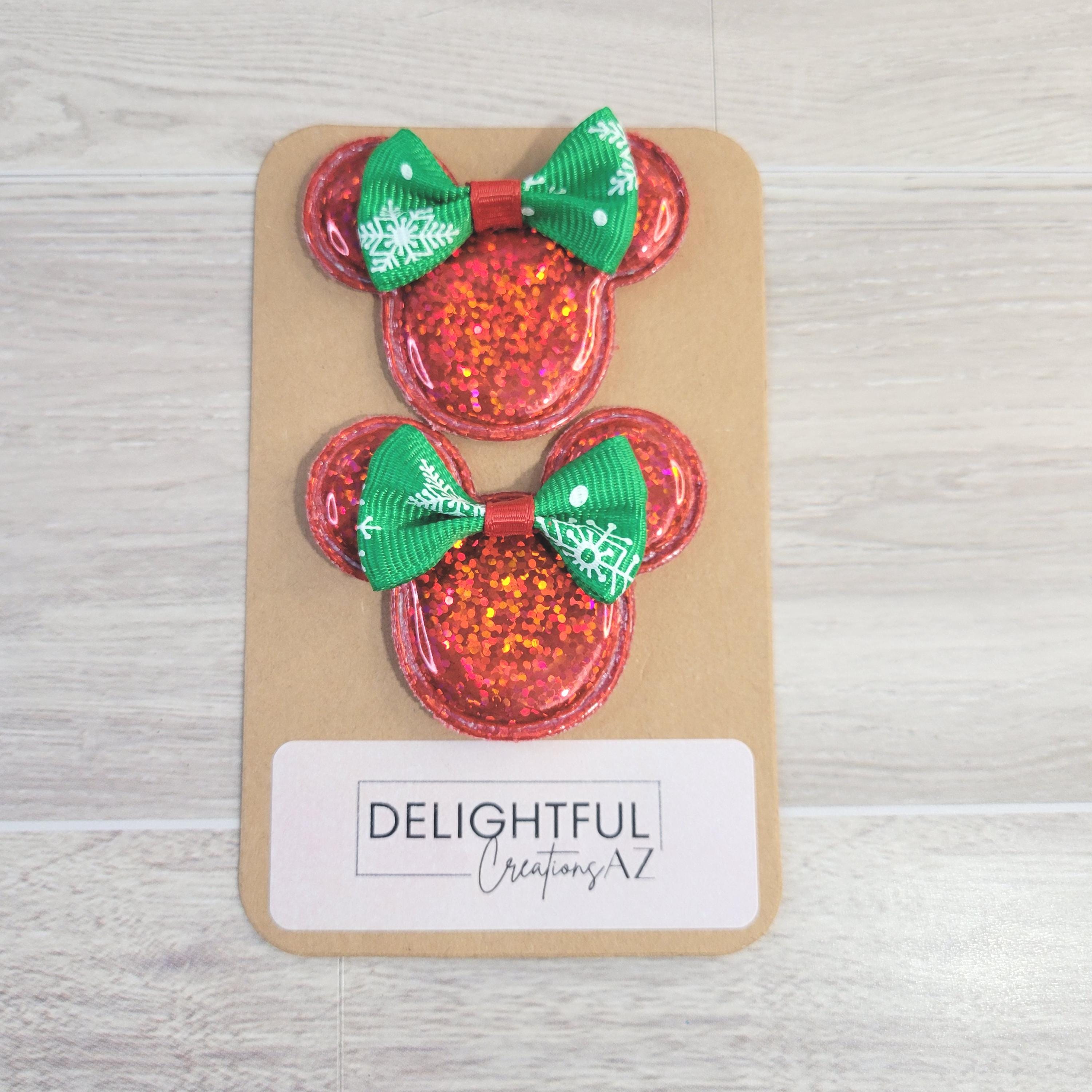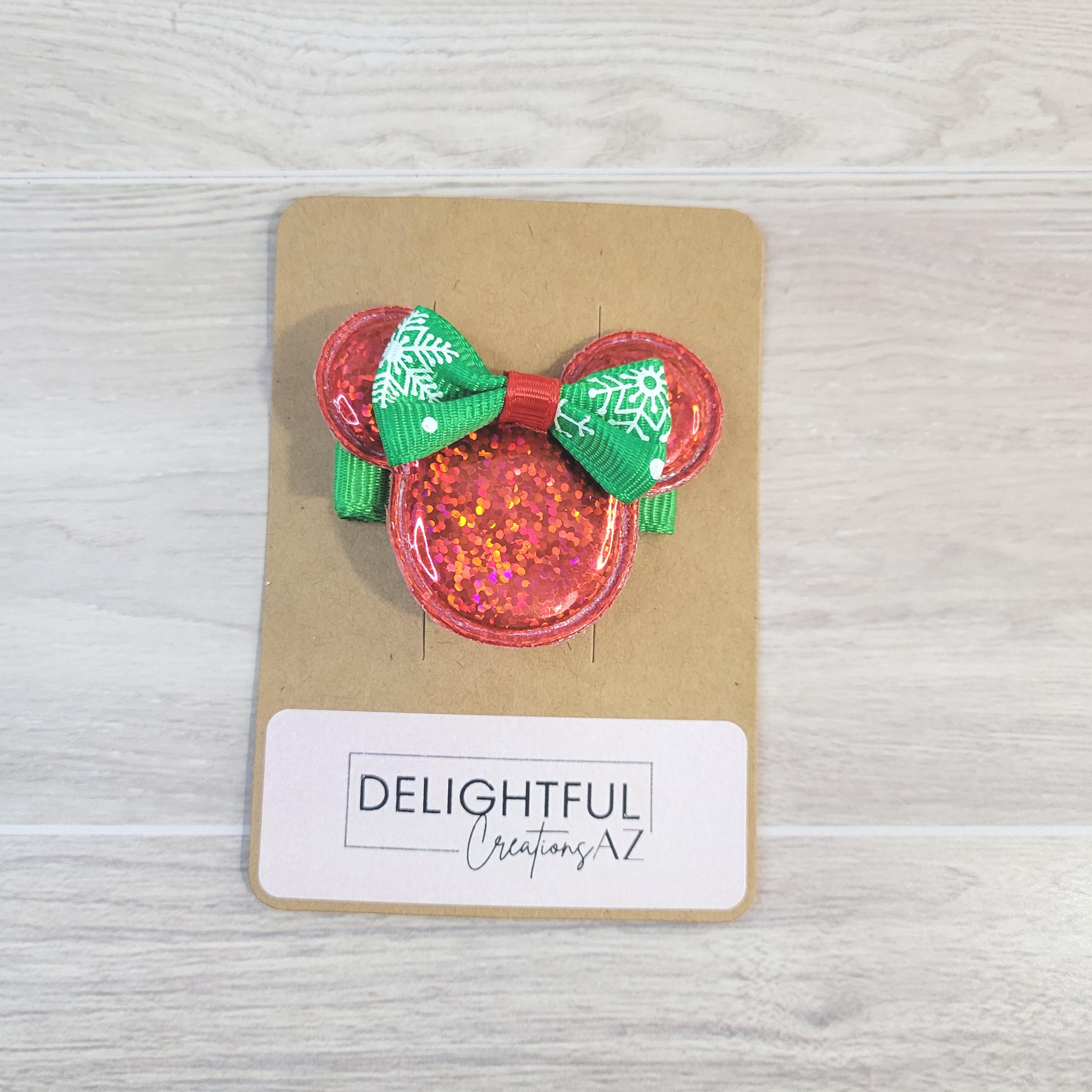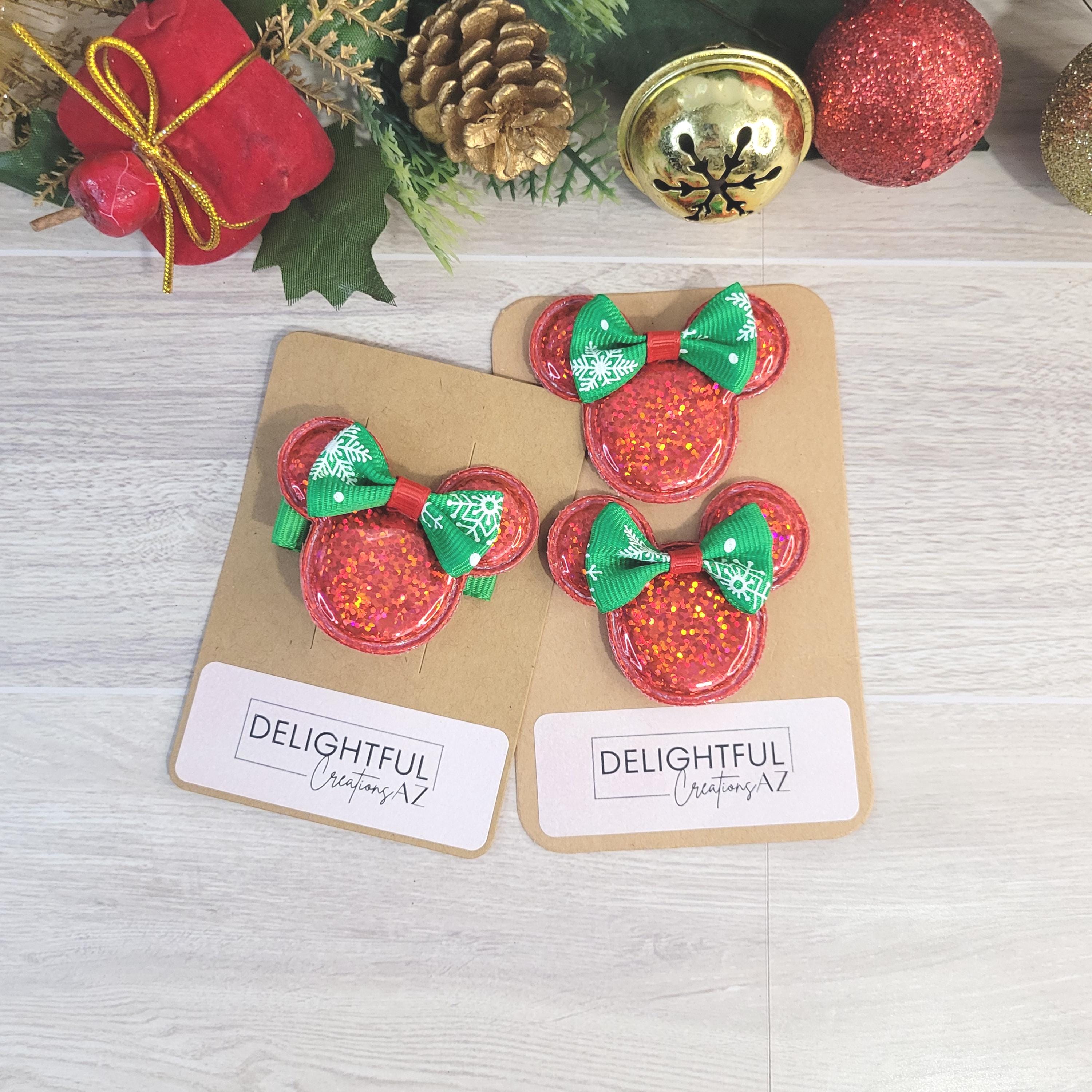 Holiday Mickey Shoe & Hair Clip – Red Holo-Laser – Green Snowflake Bow – Disney Inspired