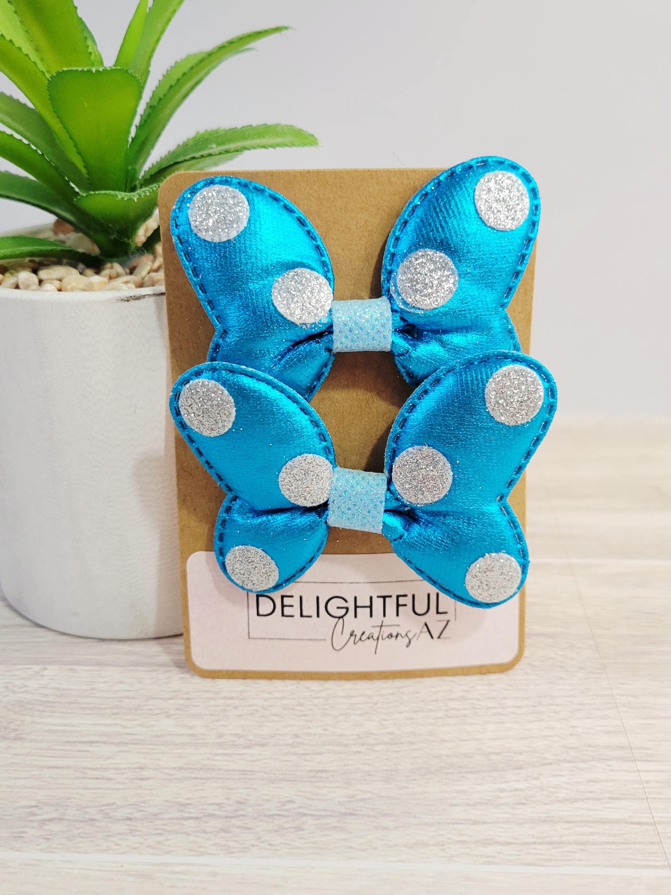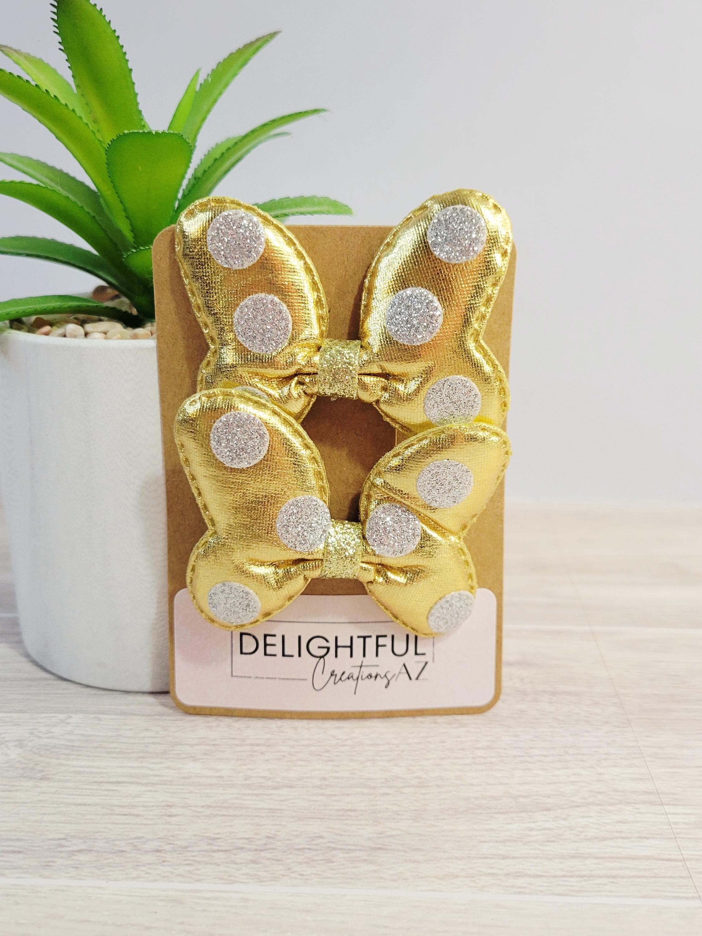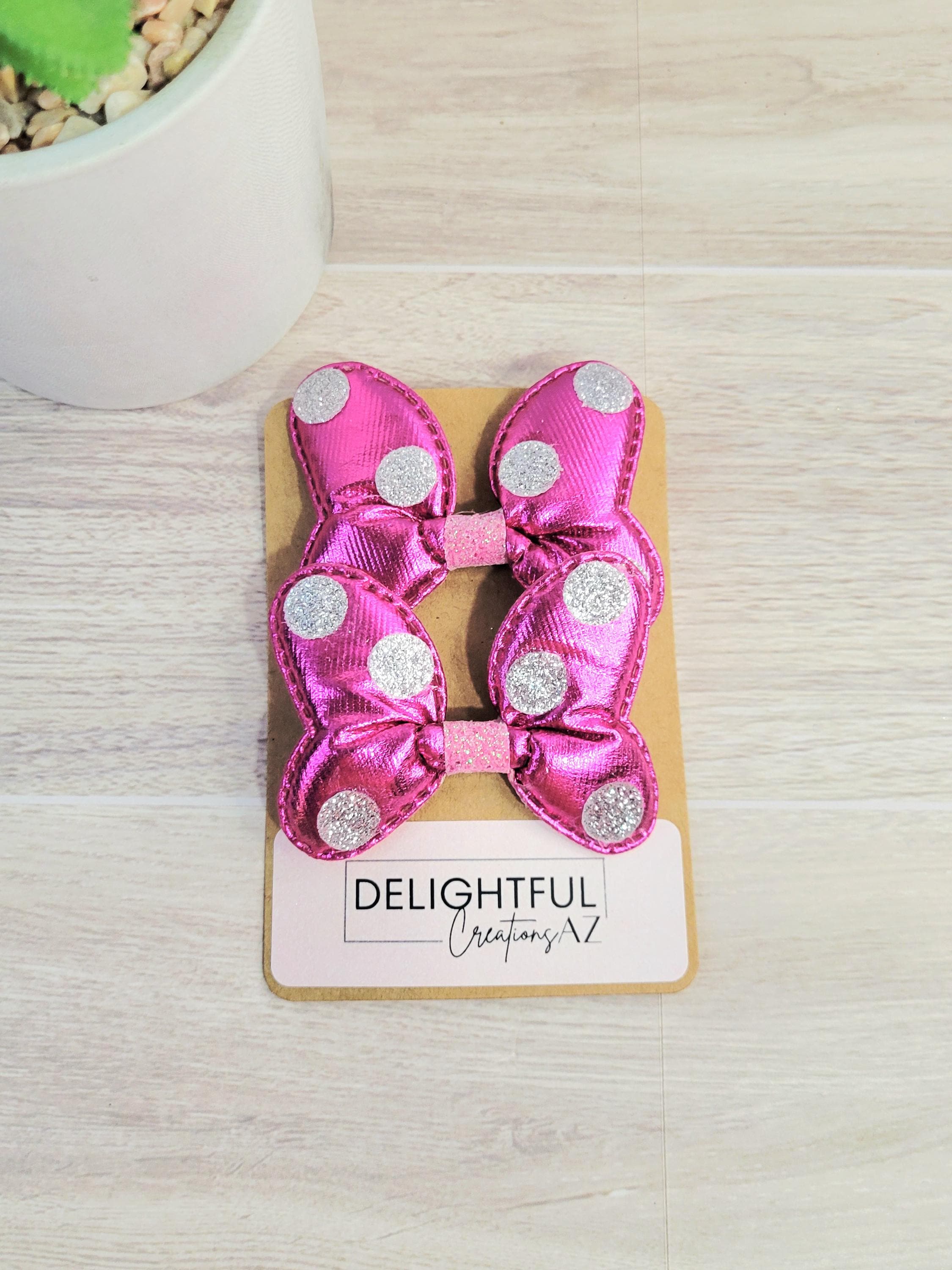 Get ready to dazzle and delight with these shimmery bow hair clips! Bursting with vibrant colors like blue, gold, red, silver, pink, and magenta! Each clip is sprinkled with playful glittery polka dots and topped off with a shimmery finish that screams “look at me!” Whether you’re jazzing up your everyday look, partying like it's your birthday, or chasing magic on a Disney adventure, these clips have you covered.