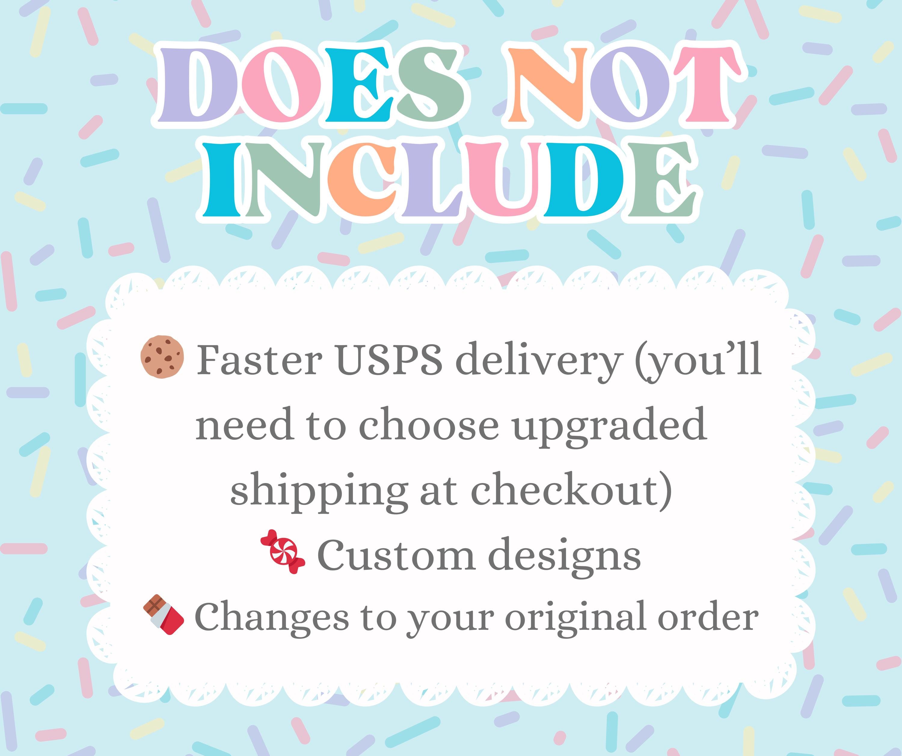 This listing ADD‑ON is a Sugar‑Rush Processing Upgrade. Add it to your cart along with your order if you need faster processing, a quick turnaround, or a priority rush order upgrade so your goodies are created and sent out sooner than my standard queue.