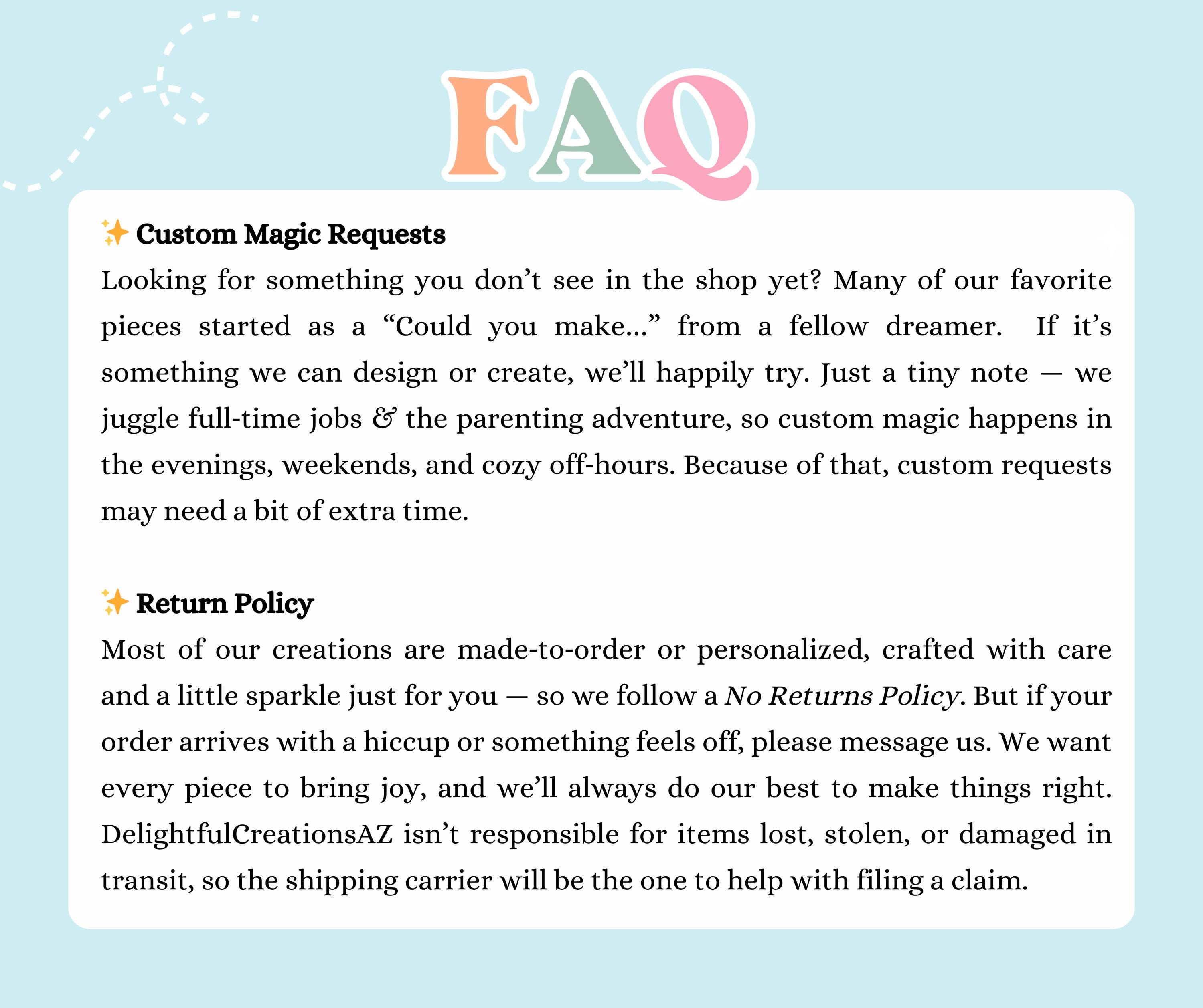 DelightfulCreationsAZ is not liable for any products damaged, lost or stolen during shipping. Please contact the shipment carrier to report the issue and file a claim. We are not responsible for lost packages due to incorrect or incomplete addresses. Please ensure that all shipping information is accurate when placing your order.